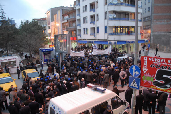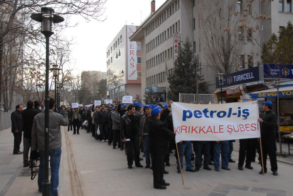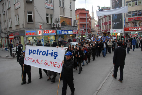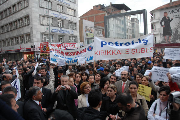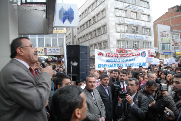 13 Mart 2008 Perşembe günü Kırıkkale’de Ak Parti İl Binası önünde Kırıkkale Emek Platformuna bağlı tüm kuruluşların katılımıyla bir basın açıklaması yapıldı. Basın açıklamasını Emek Platformu Dönem sözcüsü Şube Başkanımız Recep Sefer yaptı. Sefer; bu yasa çıktığı zaman çocuklarımızın geleceği tehlikeye girecek, emeklilik yaşı 65’e çıkarılacak, prim gün sayısı 9 bine yükselecek, yani kısacası hayatımız felç olacak bu yasayı çıkartmamak için hep birlikte savaşmamız gerekir yoksa iş işten geçtikten sonra herkes başını taşlara vuracak. Bu yasayı meclisten geçirmeyelim, tepkimizi hep birlikte dile getirelim dedi. Konuşmasına devam eden şube Başkanımız bu hükümet cesaretlendi bu cesaretin sonu nereye varacak bilemiyorum eğer ki bunlara karşı direnemezsek her şeyimizi elimizden alacaklar bugün sokaklarda olmazsak başka ne zaman olacağız, elimizdeki haklar gittikten sonra hiçbir şeyin anlamı kalmayacak, bu yasa meclisten çıkmamalı, bu hükümet ABD’nin istekleri doğrultusunda bizleri yönetiyor. Bu işe destek veren suça ortak olacaktır. Meydan şahit olsun AKP olduğu sürece mağduriyetler yaşanacaktır. dedi bu yasaya karşın tüm iş yerlerinde saat 10.00 ile 12.00 arası iş bırakılacağını söyleyerek konuşmasını bitirdi. Ardın Emek Platformu üyeleriyle birlikte AK Parti İl Binası önüne siyah çelenk bırakıldı.