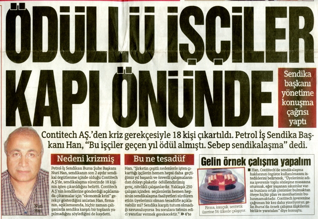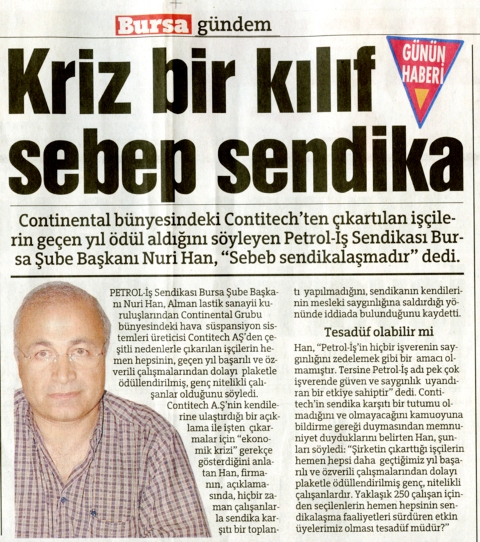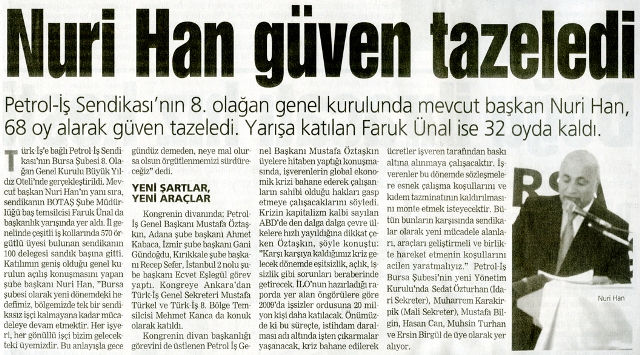 Sendikamızın Bursa Şubesi’nin 2 Kasım 2008 tarihinde Bursa Büyükyıldız Oteli’nde yapılan 8. Olağan Genel Kurulu’nda Şube Başkanlığı’na Nuri Han yeniden seçilirken Şube İdari Sekreterliğine M. Sedat Özturan, Şube Mali Sekreterliğine Muharrem Karakiprik seçildi. Yönetim Kurulu Asil üyeliklerine de Muhsin Kurhan, Mustafa Bilgin, Hasan Can ve Ersin Birgül seçildiler.