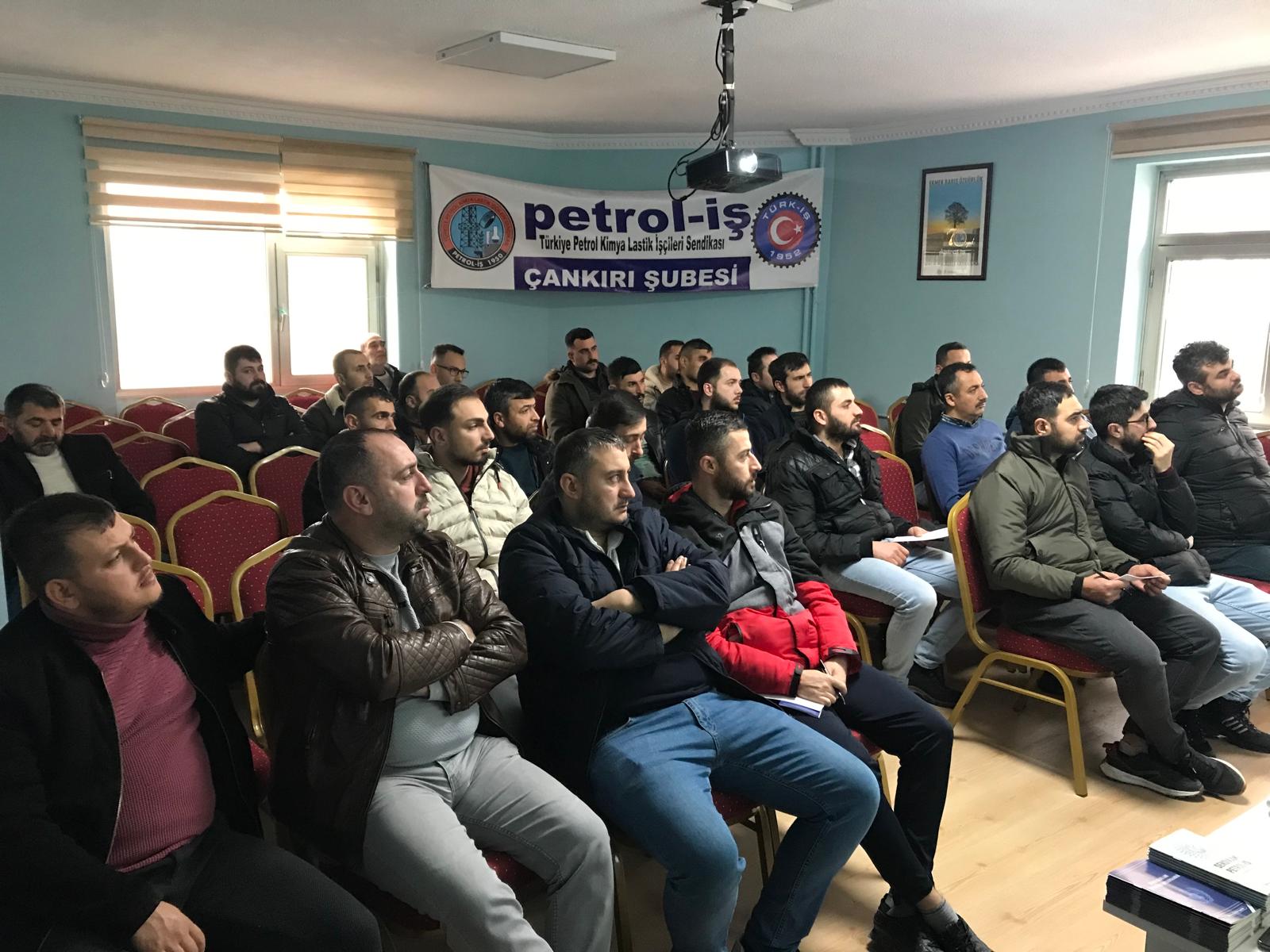 Toplantı Şube Başkanı Halil İbrahim Topçu’nun açılış konuşmasıyla başladı. Topçu, katılımcıları tanıttıktan sonra eğitimin amaçlarına değindi. Örgütlü mücadelenin gerekliliğine dikkat çeken Topçu’nun konuşmasının ardından sözü Petrol-İş Sendikası Genel Örgütlenme ve Eğitim Sekreteri Niyazi Recepkethüda aldı. Recepkethüda, Petrol-İş’in Çankırı’da yürüttüğü örgütlenme mücadelesinin önemine değinerek sendikanın varlığının getirdiği faydaları vurguladı. Konuşmasının ardından üyelerimizden gelen sorulara cevap verildi. Ardından Eğitim Servisi uzmanlarımızın sunumlarıyla program devam etti.