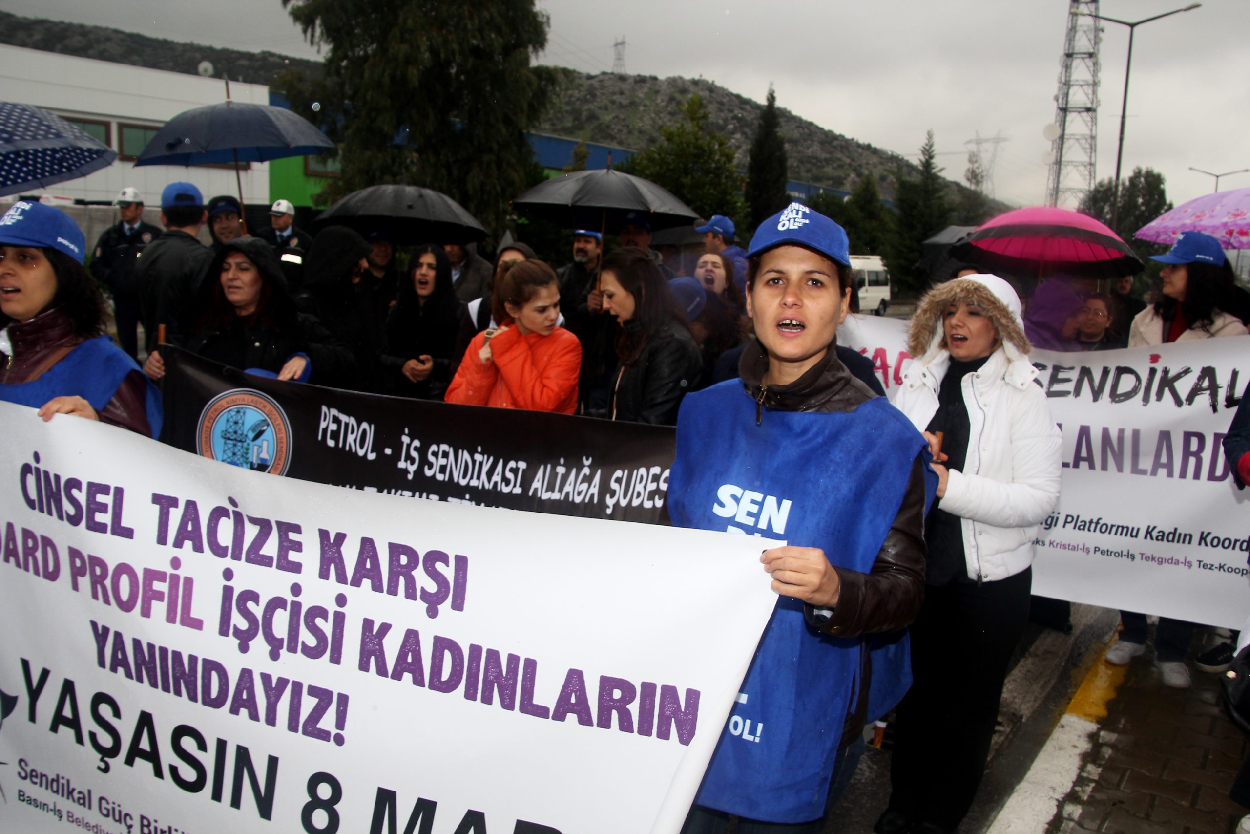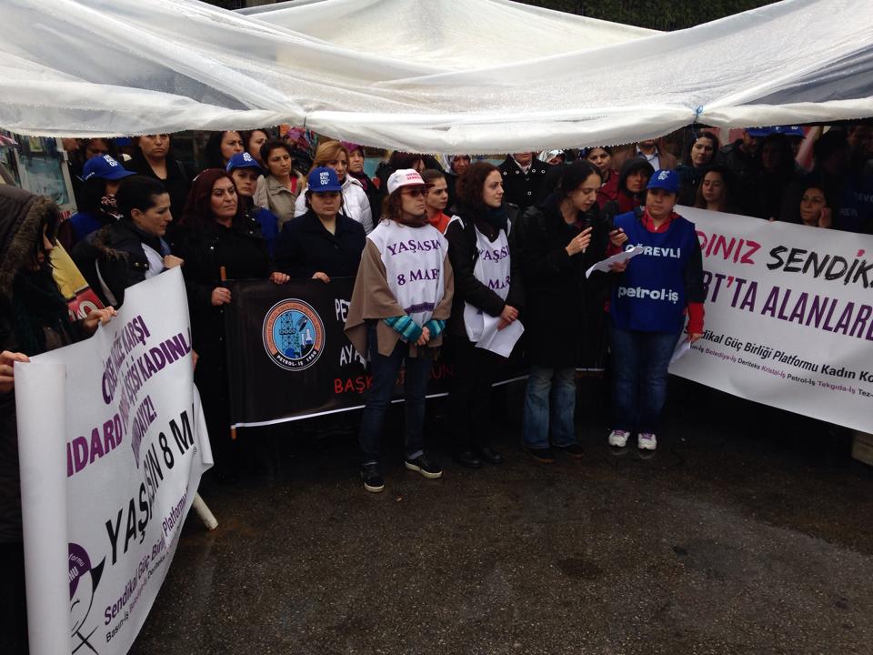 “Emeğimiz, bedenimiz, kimliğimiz bizimdir” sloganlarının ardından Standard Profil’de direnen kadınlar adına konuşan Ayşen Tufan, yaklaşık 300 gündür sendikalaşma mücadelesi verdiklerini, çocuklarının gelecekleri için, huzur içinde, eşit bir şekilde çalışabilmek için, işsiz kalma korkusu yaşamamak için Petrol-İş’e üye olduklarını belirttikten sonra, işverenin baskıcı tutumlarına değindi. Sendikadan istifa etmeleri için işverenin çirkin söylentiler yayma tehditiyle karşılaştıklarını, direniş boyunca işveren vekilinin cinsel tacizlerine ve mobbingine maruz kaldıklarını belirten Tufan, “Standard Profil işyerinin kapısından sendikalı olarak halaylarla gireceğiz” dedi.