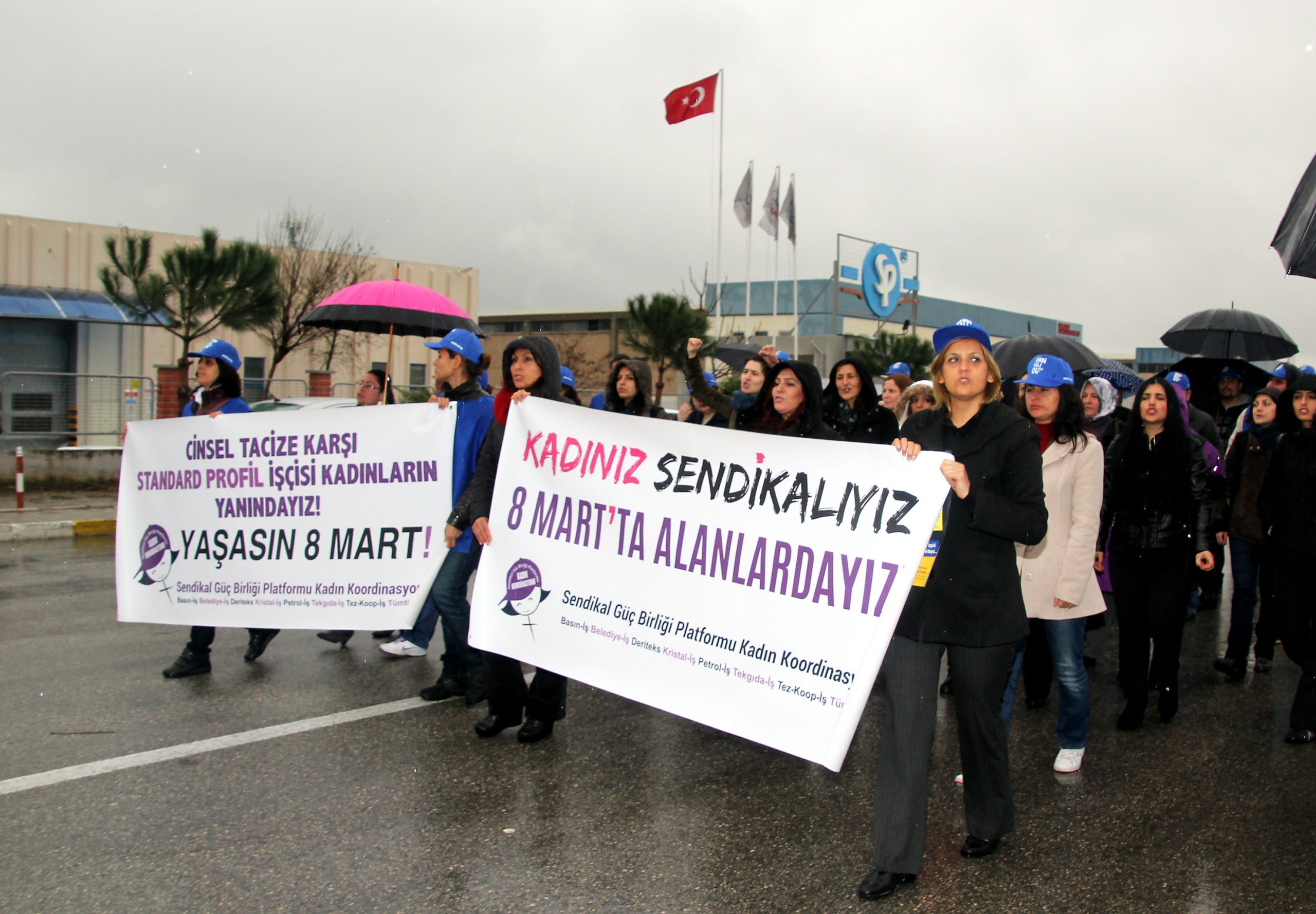 Salı gecesi saat 22.30’da Petrol-İş Genel Merkezi’nden kalkan otobüsle yola çıkan ve Çarşamba sabahı Manisa’ya varan SGBP Kadin Koordinasyonu’na bağlı sendikalardan, İSİG Meclisi’nden, DİSK Kadın Komisyonu’ndan destekçi kadınlar, saat 11.00’de Standard Profil işyerinin önünde coşkulu bir kalabalık tarafından karşılandı. Yoğun yağış bile katılımı  etkilememişti. İstanbul’dan hareket eden Sendikal Güç Birliği Platformu Kadın Koordinasyonu’nun katılımından sonra Tekgıda-İş İzmir 3 No’lu ve 7 No’lu şubelerden ve Petrol-İş Aliağa Şubesi’nden kadınlar da gruba katıldı.