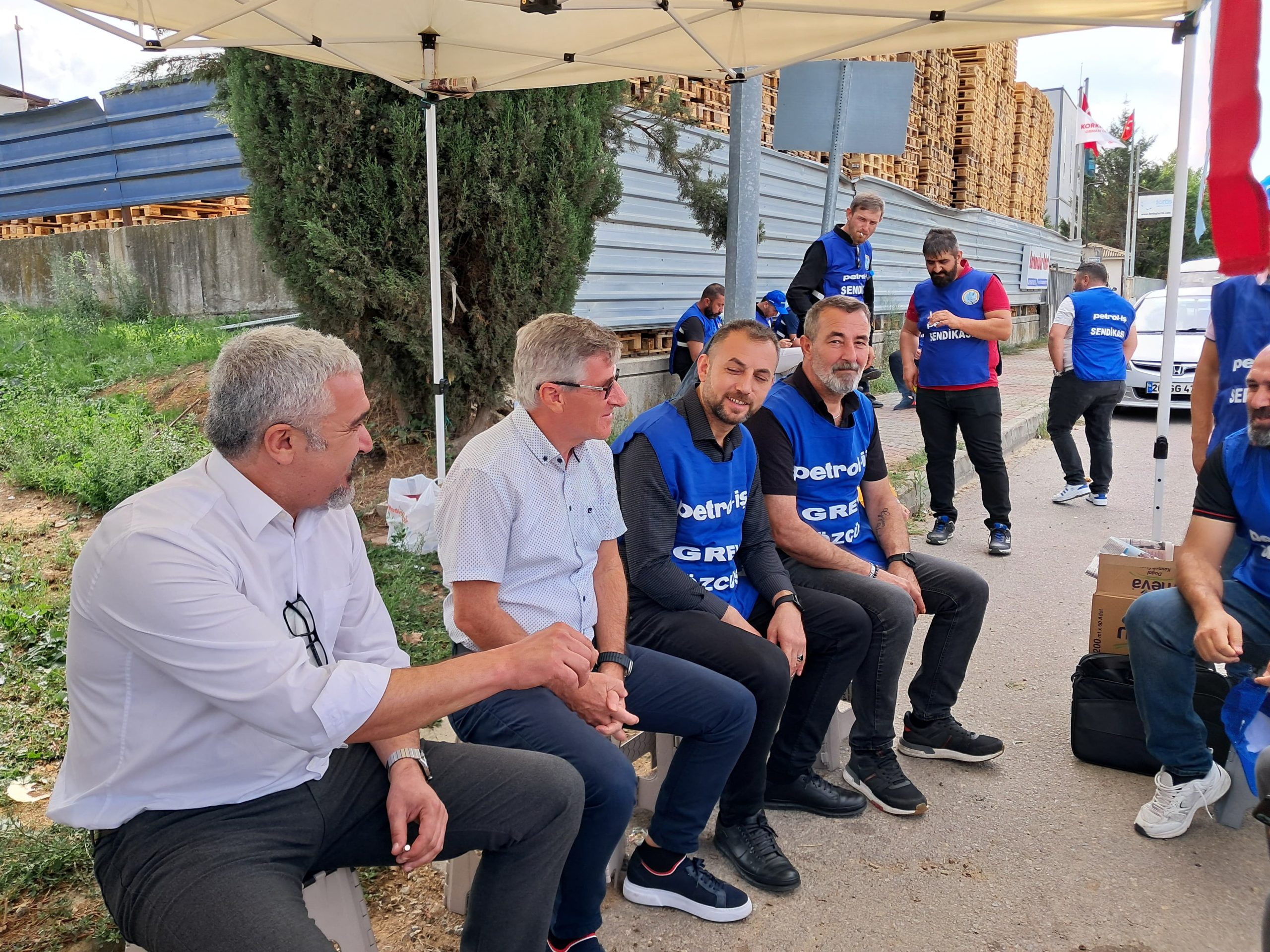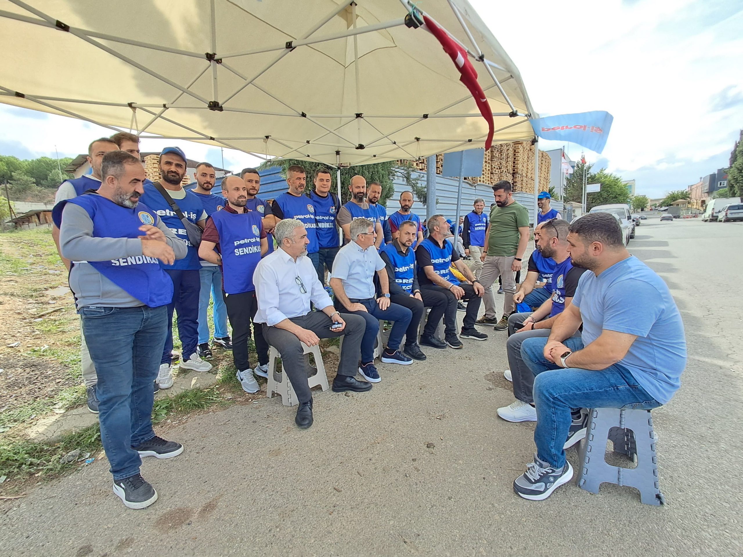Sendikamız Genel Başkanı Süleyman Akyüz, Genel Mali Sekreteri Mehmet Kaya ile Genel Yönetim Sekreteri Ali Haluk Koşar da grev alanında üyelerimizle bir araya gelerek üyelerimizle dayanışma içerisinde olduklarını gösterdiler. Genel Başkanımız Süleyman Akyüz ve Genel Mali Sekreterimiz Mehmet Kaya grev alanında yaptıkları konuşmalarla Petrol-İş Sendikası’nın mücadele ve müzakereyi en iyi şekilde kullanan sendika olduğunun altını çizerek işvereni bir kez daha masaya davet ettiler.