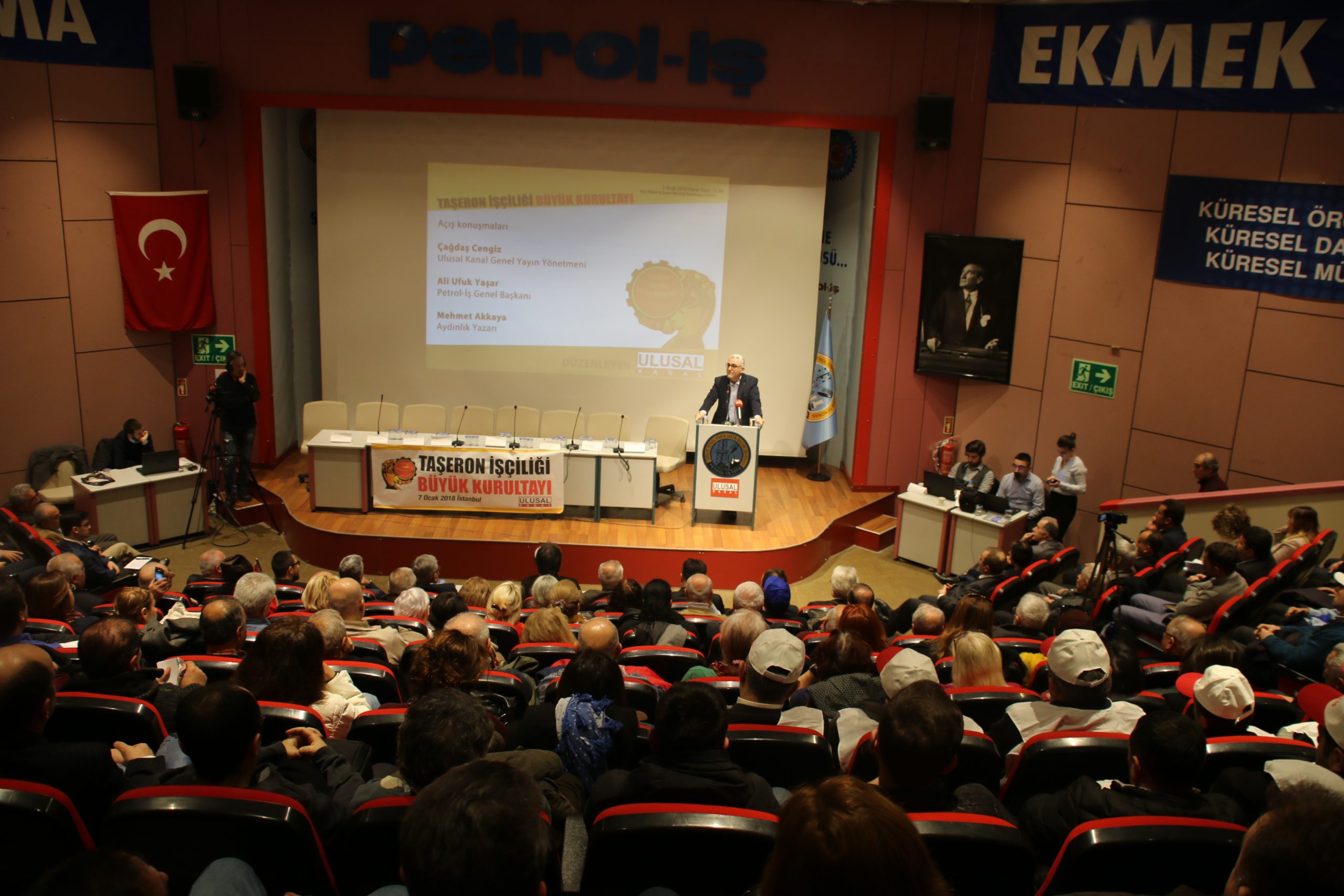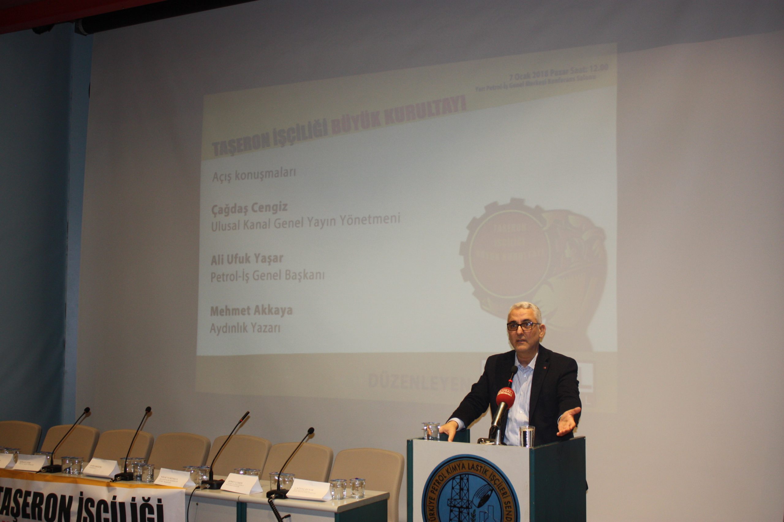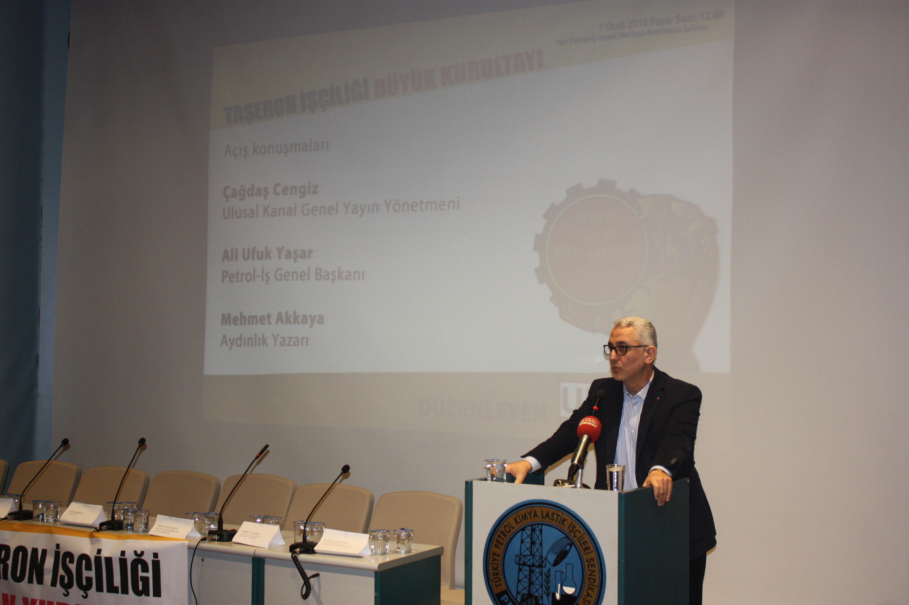 Genel Başkanımız Ali Ufuk Yaşar, Ulusal Kanal Genel Yayın Yönetmeni Çağdaş Cengiz’in açış konuşmasının ardından bir konuşma yaptı. Kadroya alınmasını istedikleri işçilerin hiçbirinin kadroya alınmadığına dikkat çeken Yaşar, “1 milyon 20 bin kişiden bahsediliyor fakat kamu iktisadi teşebbüslerinde çalışan 50 bin kişi bizzat asıl işi yapan taşeron işçileri kapsamdışında tutuldu. Petrol-İş Sendikası’nın örgütlü olduğu Botaş’ta, Makina Kimya’da vs. asıl işi yapan arkadaşlarımız kadroya alınmadı. Kimsenin sevincini kursağında bırakmak istemiyorum ama gerçek olan bu. ‘Taşeron işçisine kadro verdik, taşeron meselesini hallettik’ demek çok büyük haksızlık. 8 Ocak’ta (bugün) yine Ankara’da bununla alakalı çok değerli bölge başkanları, sendika genel bakanları Türk-İş tarafından toplanacak. Bu konuların tekrar düzenlenmesine dair mücadelemiz devam edecek. Bizim için dağ fare bile doğurmamıştır. Bu konuyu ülkemiz adına, halkımız adına takip edeceğiz.”dedi.