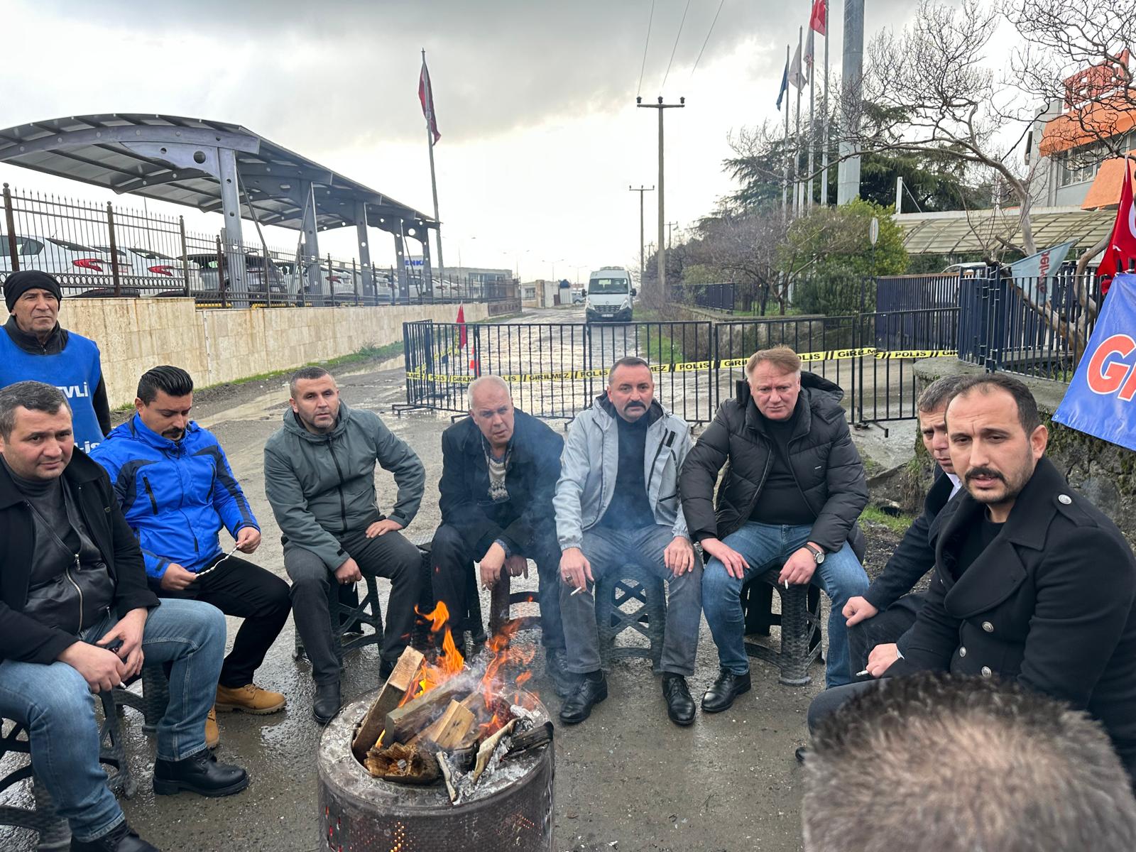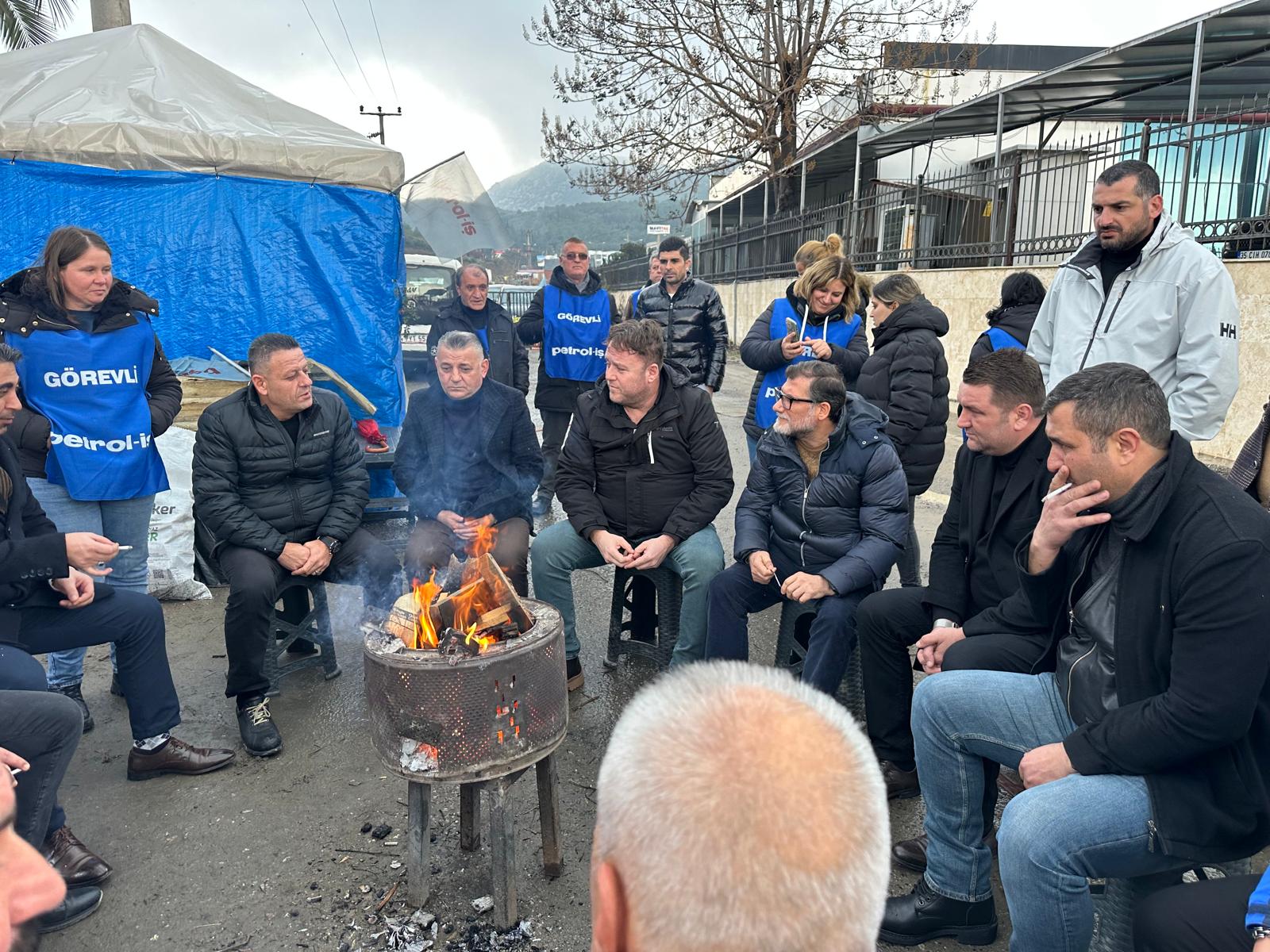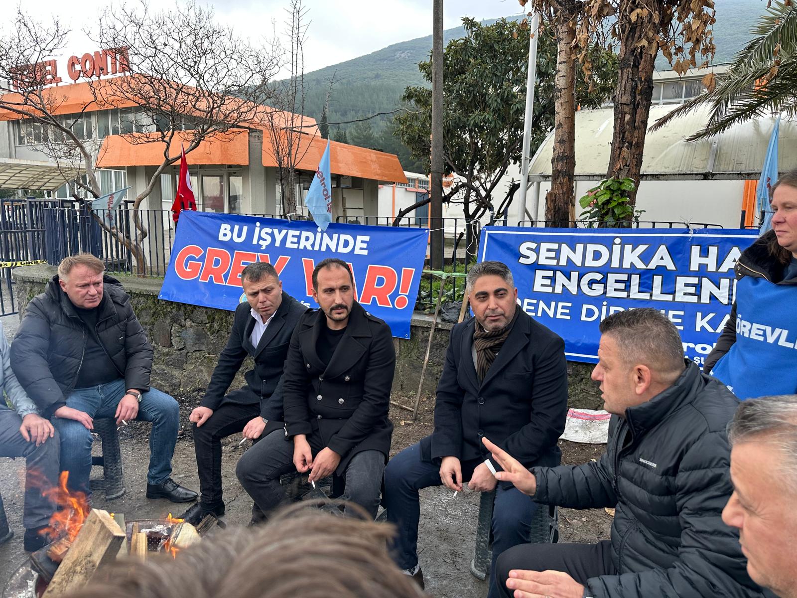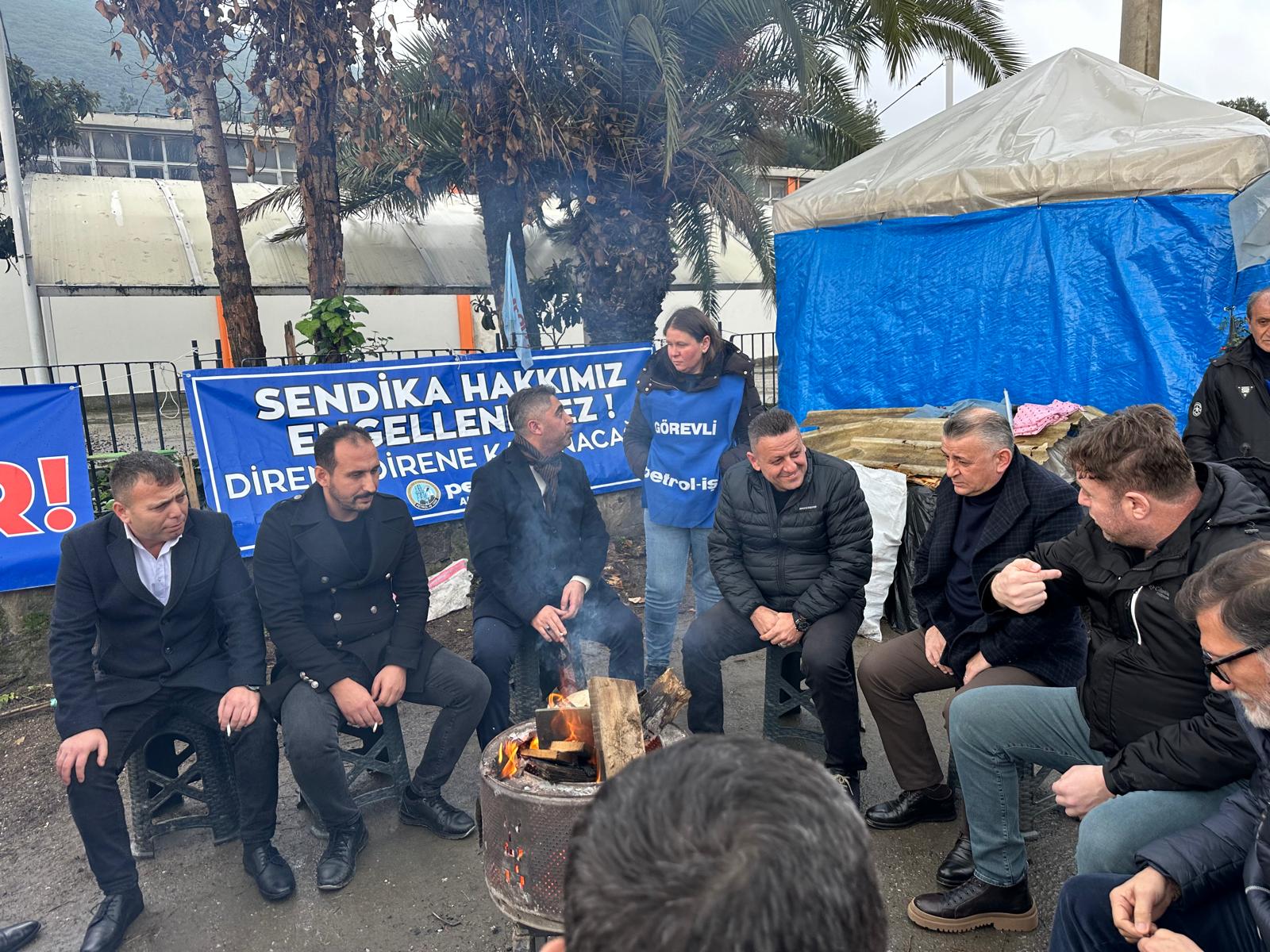 Grev Çadırı önünde yapılan sohbetin ardından “Kurtuluş Yok Tek Başına, Ya Hep Beraber Ya Hiç Birimiz”, “Sendika Hakkımız Engellenemez” sloganları grev alanından yükseldi.