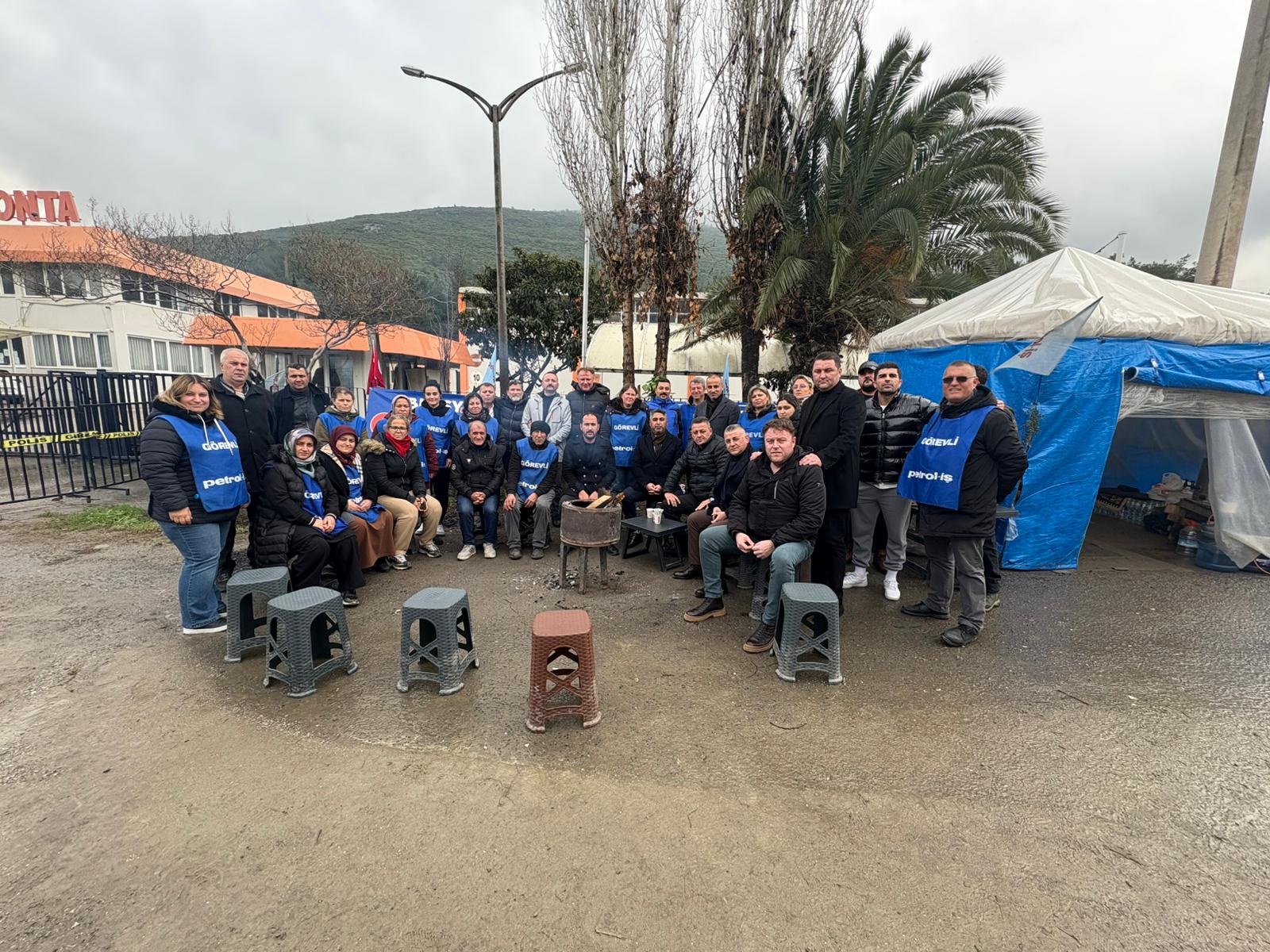 Aliağa Şube Yönetimi ve grevci üyelerimiz ziyarete gelen Şube Yöneticilerimizi “Yaşasın Sınıf Dayanışması” sloganı ile karşıladı. Yine grev alanında Aliağa Şubemizin örgütlü olduğu işyerlerinden temsilci ve üyelerimiz de yer aldı.