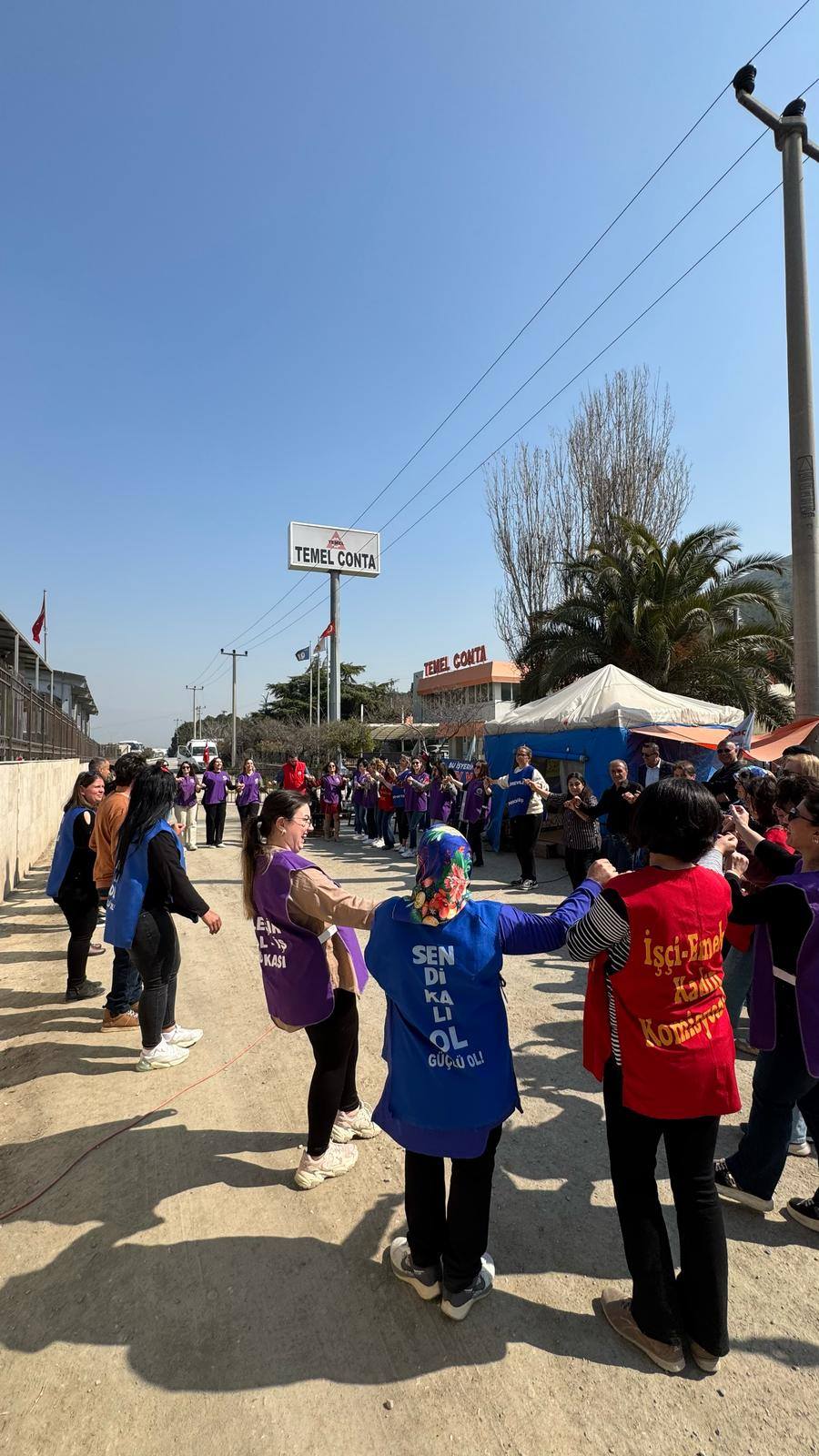 Güçlü katılımın sağlandığı buluşmada Aliağa Şube Başkanımız Hasan Toptan kadınların çalışma hayatında maruz kaldığı düşük ücretlere, güvencesiz çalışma koşullarına ve işyerindeki eşitsizliklere dikkat çektiği konuşmasında bir kez daha mücadele çağrısı yaptı. Hasan Toptan yaptığı açıklamada “Kadınlar emeğin en büyük gücü ve en büyük direnişçileridir! Bugün burada yalnızca kadın hakları için değil, tüm emekçilerin hakları için de sesimizi yükseltiyoruz. Bu mücadele sadece bir grup işçinin değil, hepimizin mücadelesidir. Temel Conta grevimiz, emeğin, eşitliğin, adaletin ve insanca yaşam hakkının direnişidir. Bugün buradayız, çünkü biliyoruz ki mücadele edersek kazanırız, bir arada olursak kazanırız! Hiçbir hak mücadele edilmeden kazanılmadı!” diyerek dayanışmanın önemine vurgu yaptı. Grev alanında yapılan konuşmalar ve sohbetin ardından halay çekildi, sloganlar atıldı.