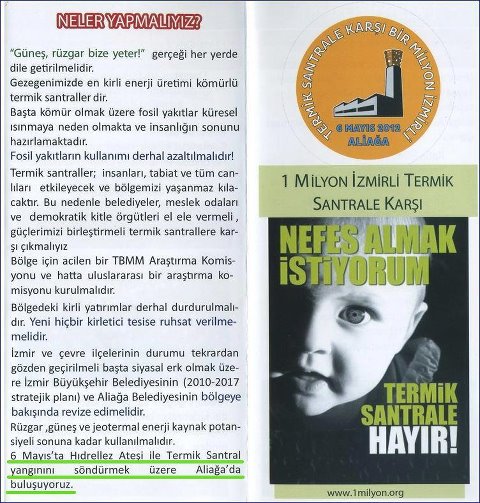 Platform, 6 Mayıs’ta yapılacak büyük mitinge kadar hafta içi her gün saat 17.30 ile 18.30 arası Aliağa Demokrasi Meydanı’nda stand açarak ve termik santrale karşı imza toplayarak termik santralin zararlarını broşürlerle halka anlatıyor.