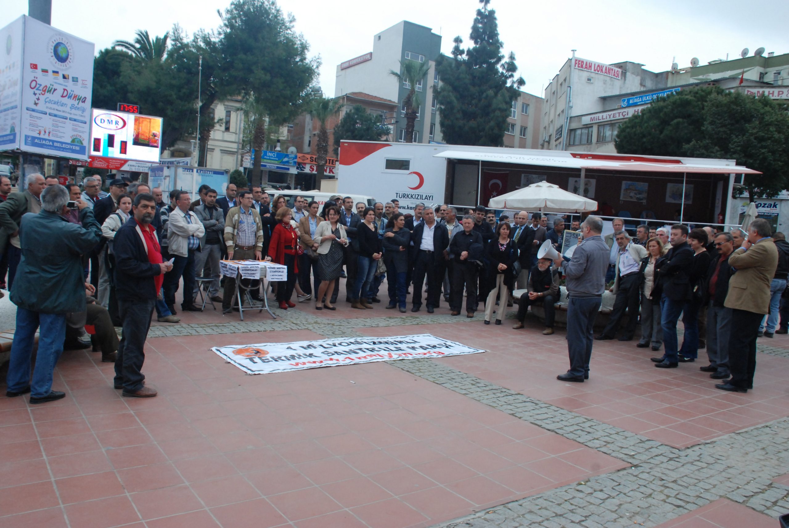 Platform üyeleri, termik santral karşıtları olarak Aliağa Demokrasi Meydanı’nda, “Termik santral istemiyoruz”, “Termik santral ölüm kusacak” sloganları ve alkışlarla tepkilerini dile getiriyor. Petrol-İş Aliağa Şube Başkanımız İsmail Doğan yaptığı konuşmasında, “26 Nisan 2012 tarihinde, Petkim’in kurmak istediği termik santralin ÇED Toplantısına çok kalabalık katılmamız gerekiyor. Kalabalık olmamızdan rahatsız olanlar olacak. Korkunun perdesini yıkacağız. Susmayacağız. Kendimiz için değil İzmir ve yöre halkı için mücadele ediyoruz. Bıkmadan, kömürle çalışacak santrale karşı çıkacağız. Elimizden gelen çabayı göstereceğiz.” dedi.