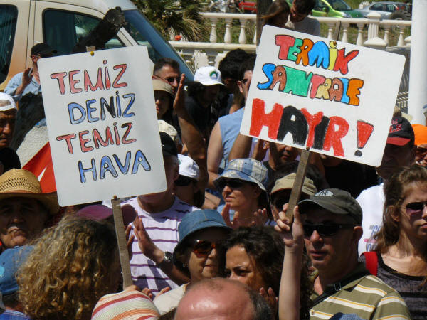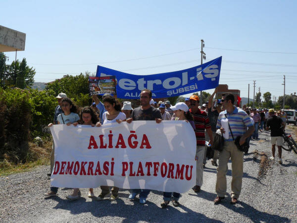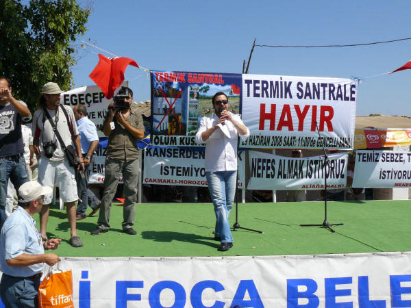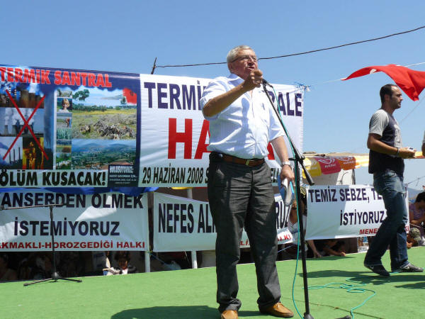 TERMİK SANTRALE HAYIR!Bölgemizde, Horozgediği Köyü yakınlarında yapılmak istenen, kömüre dayalı termik santrale karşı eylemlerimiz devam ediyor.Aliağa Emek ve Demokrasi Platformu olarak, 27-28 Haziran tarihlerinde Aliağa’da stand kurarak yapılmak istenen termik santrale karşı imza kampanyası başlatıldı. İki gün süren imza kampanyasına binlerce vatandaşımız destek verdi. 29 Haziran Pazar günü Gencelli sahilinde yapılan miting ile kamuoyuna konunun önemi bir kez daha hatırlatılmıştır.Termik santralin kurulması planlanan Gencelli Sahilinde yapılan mitinge, çevre belediyeler ile birçok siyasi parti ve sivil toplum örgütleri katıldı. Katılımcıların ortak görüşleri, Kapitalizmin kar hırsına toprağımız, suyumuz, sağlığımız feda edilmek istenmektedir. Var olan ağır sanayi kuruluşları ile yeterince kirlenen bölge, termik santralin kurulması halinde yaşanabilir bir yer olmaktan çıkacaktır. Burada bir termik santralin kurulması, bölgenin tamamen feda edilmesi olacaktır ve çocuklarımıza miras olarak, mavi deniz, yeşil doğa yerine, baca gazlarıyla kirlenmiş bir gökyüzü, atıkları ile yaşanmaz olan bir çevre bırakmak zorunda kalacağız dendi. Katılımcılar 19 yıl önce bu santral nasıl engellendiyse bugün de engelliye-biliriz diyerek toplantı bitirildi.