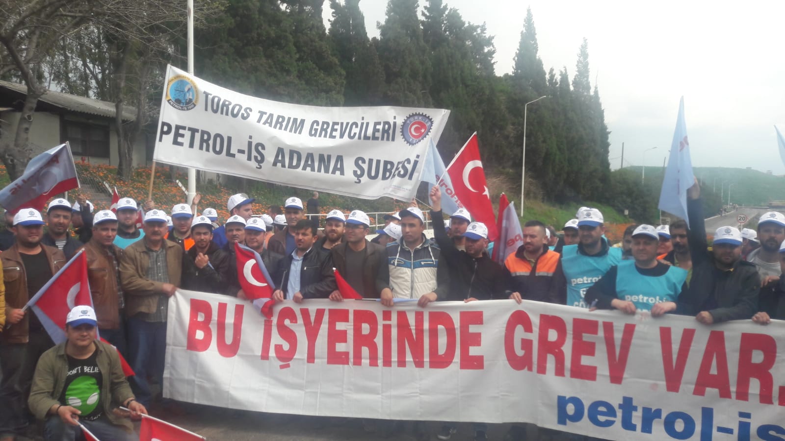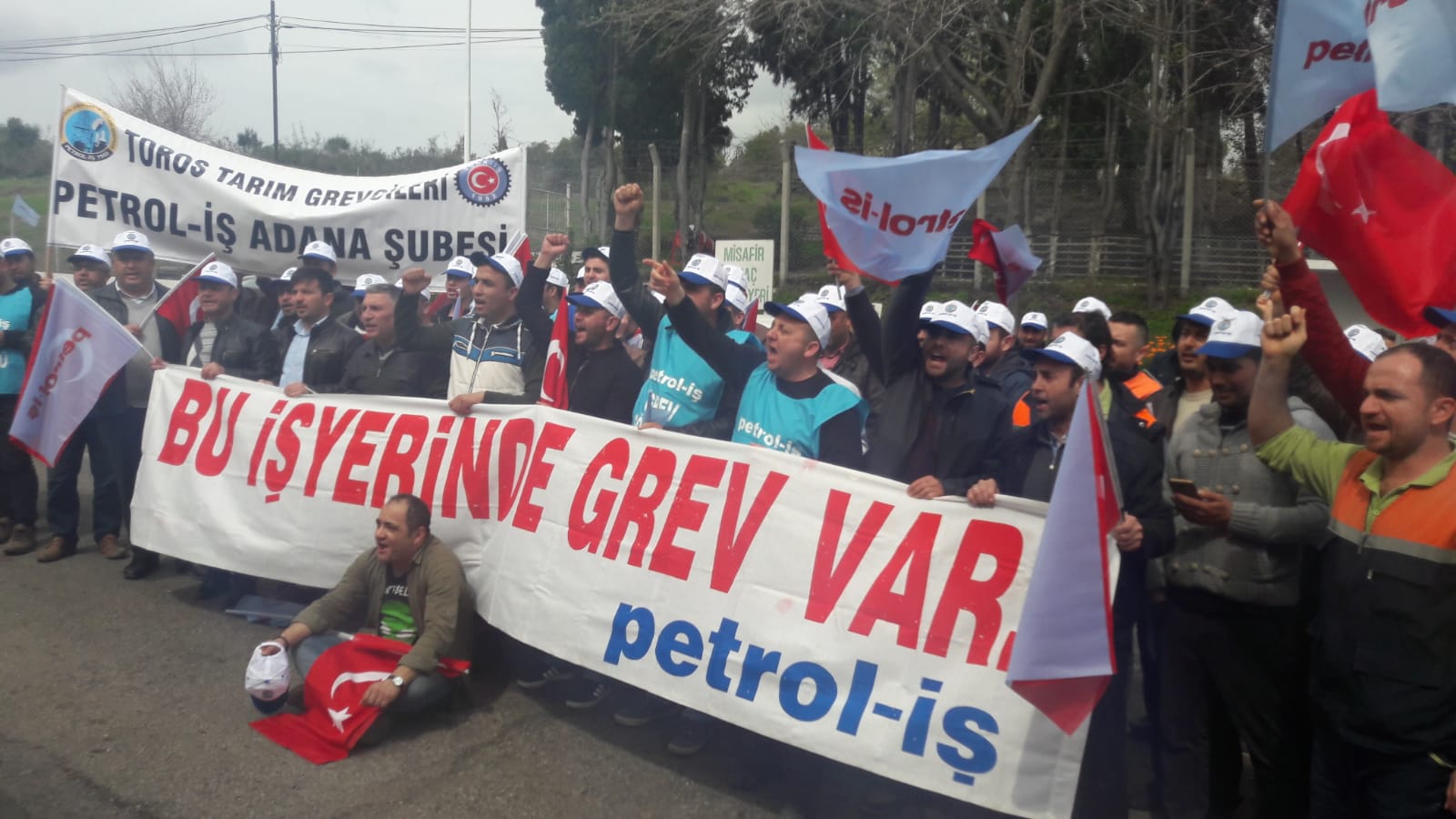 Toplu sözleşme görüşmelerinde sonuç alınamaması üzerine bu sabah Toros Tarım işletmesine bağlı Ceyhan ve Mersin/Akdeniz işyerlerine “Bu işyerinde grev vardır” pankartlı asılarak, coşkulu bir şekilde greve başlandı.
