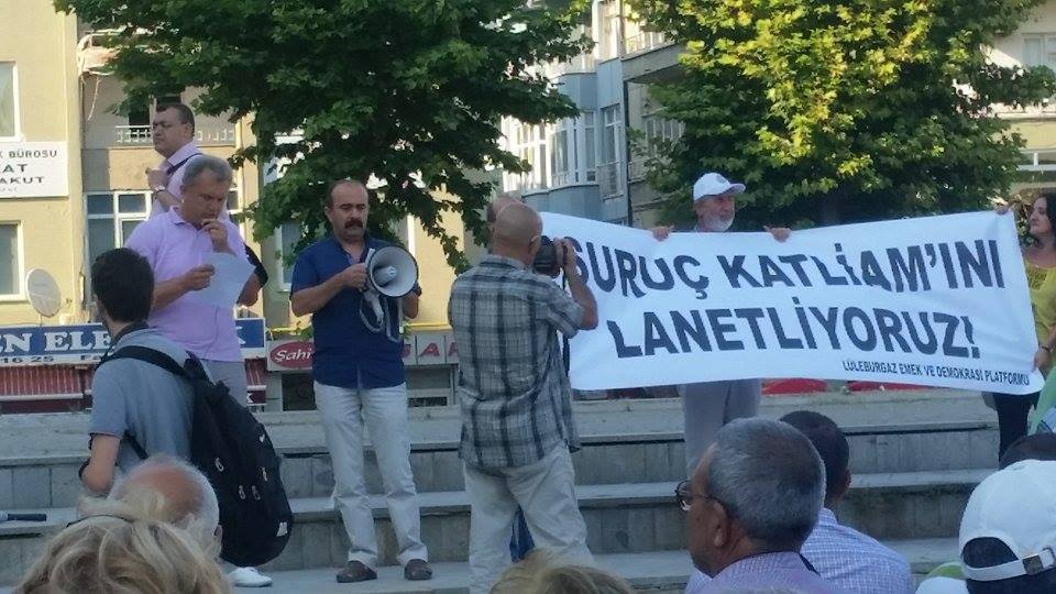 Trakya şubemiz 20 Temmuz tarihinde Suruç’ta gerçekleştirilen hain saldırıyı protesto etmek amaçlı bir basın açıklaması düzenledi. Açıklama Lüleburgaz Demokrasi Meydanı’nda yapıldı. Lüleburgaz Emek ve Demokrasi Platformu adına basın açıklamasını Şube Başkan Yardımcımız Hasan Oğuz Keser okudu.