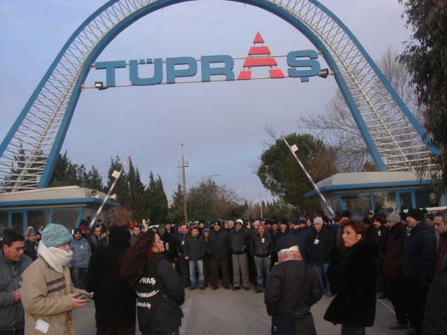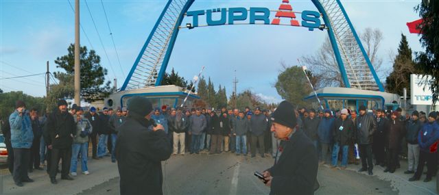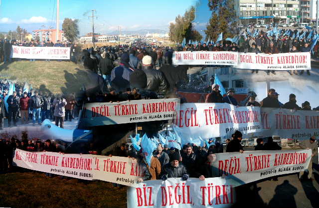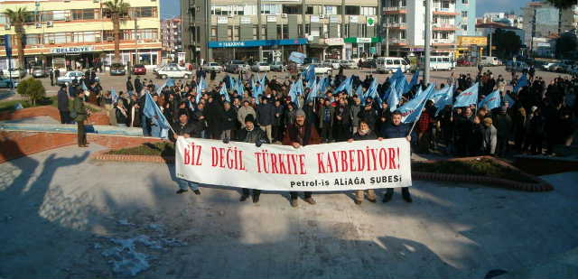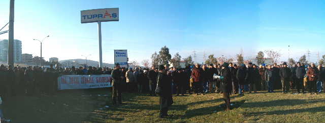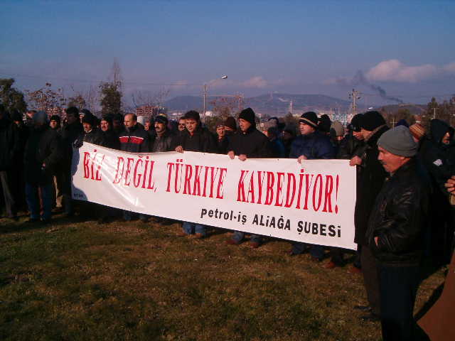 26-27 Ocak 2006 sendikamız genel merkezinin aldığı karar doğrultusunda bugün (26 Ocak 2006), bütün Tüpraş’larda olduğu gibi şubemize bağlı İzmir Rafinerisi’nde de eylem vardı.Tüpraş’ın devrine tepki olarak işçiler sabah işbaşı yapmadılar. Saat 08.00’de işe gelen işçiler, dış kapıda servislerden inerek burada toplandılar.Yaklaşık 500 işçiye hitaben bir konuşma yapan Şube Başkanı İbrahim Doğangül; ‘Tüpraş’ın satılması sürecinde yeni bir eşiğe gelindi. Bugün Tüpraş’ın KOÇ Holding’e devredilmesi beklenmektedir. Sendikamızın yıllardır süren uyarılarına karşı çıkışlarına rağmen maalesef (hem de usulsüz, hukuksuz yöntemlerle ve açılan davalar henüz sonuçlanmadan) devir işlemi bugün yapılacak. Hukuki sürecin lehimize sonuçlanması halinde bu kararı uygulatacak olan yine biz olacağız, bundan kimsenin kuşkusu olmasın.Tüpraş satılırsa biz değil, Türkiye kaybeder’ dedi. İşçiler, Doğangül’ün sözlerini; ‘Zafer direnen emekçinin olacak’ ‘Tüpraş’ı satanlar vatan haini’ sloganları ile sık sık kestiler.