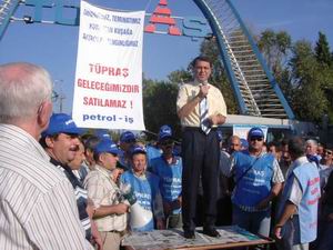 TÜPRAŞ İŞÇİSİ AYAKTA!02 Eylül 2005Birinci ihalesi iptalle sonuçlanan ve 29 Nisan 2005 günü gazete ilanı ile ikinci kez ihaleye çıkılan TÜPRAŞ’ta bugün teklif alma son günü olması nedeni ile işçiler tam gün iş bıraktı. Bugün sabah işe gelen işçiler, diğer Rafinerilerde olduğu gibi işbaşı yapmadı.Yaklaşık 500 işçi servislerden inerek “dış kapı”da toplandı. Bu işçilere, Petkim’de çalışan ve gece vardiyasından çıkan yaklaşık 400 işçi de destek verdi. Ayrıca Telekom işçileri, CHP İlçe Başkanı ve yöneticileri, EMEP il yöneticileri de basın açıklamasına katıldılar.