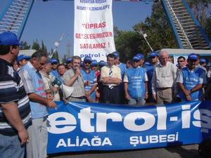 TÜPRAŞ İŞÇİSİ AYAKTA!02 Eylül 2005Birinci ihalesi iptalle sonuçlanan ve 29 Nisan 2005 günü gazete ilanı ile ikinci kez ihaleye çıkılan TÜPRAŞ’ta bugün teklif alma son günü olması nedeni ile işçiler tam gün iş bıraktı. Bugün sabah işe gelen işçiler, diğer Rafinerilerde olduğu gibi işbaşı yapmadı.Yaklaşık 500 işçi servislerden inerek “dış kapı”da toplandı. Bu işçilere, Petkim’de çalışan ve gece vardiyasından çıkan yaklaşık 400 işçi de destek verdi. Ayrıca Telekom işçileri, CHP İlçe Başkanı ve yöneticileri, EMEP il yöneticileri de basın açıklamasına katıldılar.
