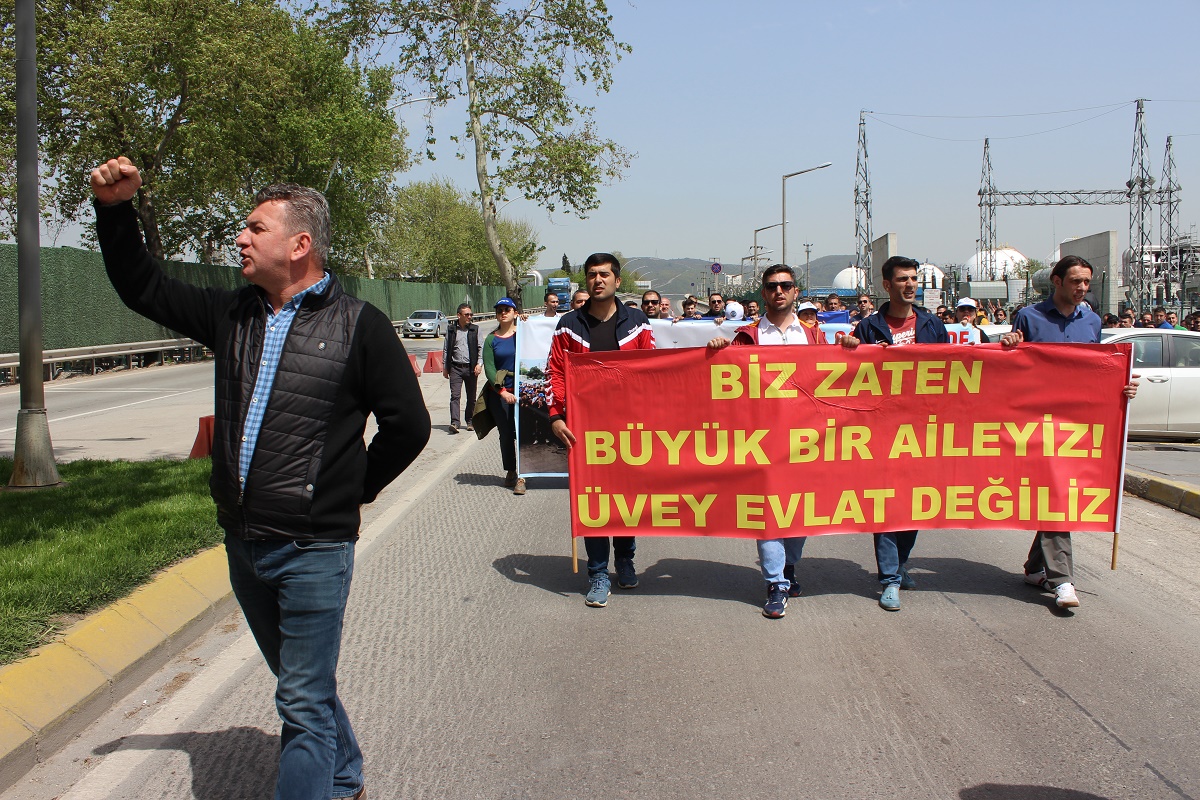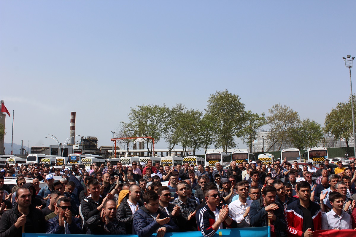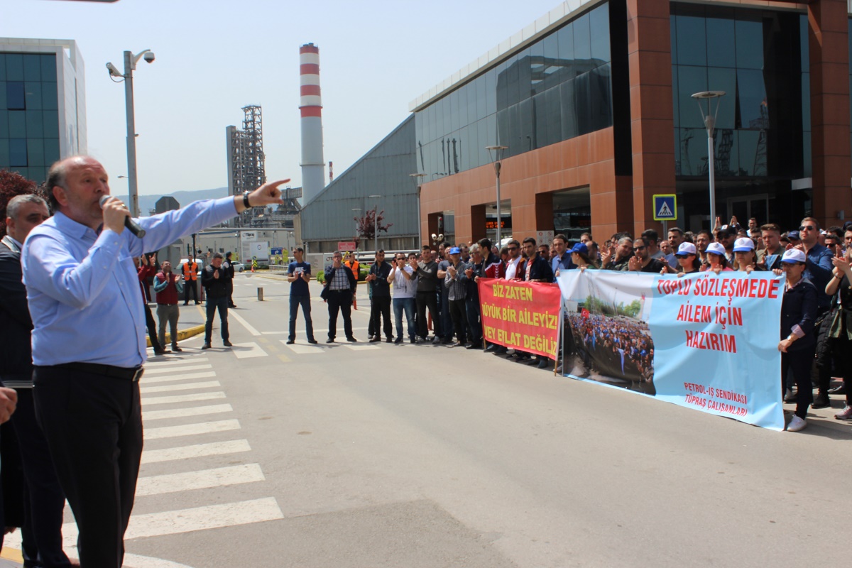 Fabrika önünde toplanan Tüpraşlı üyelerimize Kocaeli Şube Başkanımız Salih Akduman TİS ile ilgili açıklama yaptıktan sonra yüzlerce Tüpraş çalışanı kortej halinde alkış ve sloganlar eşliğinde A kapıya kadar yürüyerek saat 12:00’da işbaşı yaptılar.