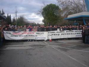 Tüpraş İşçisi Eylem Yaptı: “YARGI SÜRECİ DEVAM EDİYOR, DEVİR İŞLEMİ HUKUKSUZDUR!” 19.12.2005Bugün, sendikamızın örgütlü olduğu tüm rafinerilerde olduğu gibi, Aliağa’da ki İzmir Rafinerisi işçileri de eylem yaptı. Saat 10.00’a kadar işbaşı yapmadı, Rafineri giriş kapısında, her zamanki gibi servislerden inerek toplanan yaklaşık beş yüz işçi, pankart açarak “yargı süreci devam ederken devir işleminin yapılmaması gerektiğini” dile getirdi.İşçilere hitaben bir konuşma yapan Şube Başkanı İbrahim Doğangül özetle şöyle dedi:“Bugün Ankara İdare Mahkemesinde, Tüpraş’ın %14.76’lık hissesinin satışının iptalini istediğimiz dava, duruşmalı olarak görülecek Biz bu davaya tüm duyarlı çevrelerin dikkatini çekmek istiyoruz. Çünkü bu dava bu hükümetin yaptığı tüm şaibeli işlere iyi bir örnektir. Hukuku hiçe sayan kendi koydukları kurallara bile uymayan, her şeyi babalar gibi satarım diyen zihniyetin yargılanmasıdır bu duruşma. Son zamanlarda yargıya yapılan baskıların hangi noktaya geldiğini hepimizi yaşayarak görüyoruz, bu nedenle bizim de gözümüz kulağımız bugün Anakara’da olacak.Öte yandan, Danıştay’ın reddettiği yürütmeyi durdurma talebimiz için de sendikamız Danıştay Dava Daireleri Kuruluna itirazını yaptı, bir hafta içinde de kararını verecek. Dolayısı ile bütün bu hukuki süreç devam ederken yapılacak olan bir devir işlemini sessizce karşılamayacağız, tepkimizi hem hükümete hem de alıcı firmaya karşı en sert şekilde göstereceğiz. Kimse bundan kuşku duymasın. Bu hafta teyakkuz halindeyiz. Biz Tüpraş’ın satılmasıyla Türkiye’nin kaybedeceğini söylemeye; ülkemize de ekmeğimize de sahip çıkmaya devam edeceğiz.” Bunun ardından Genel Merkez tarafından gönderilen basın metni okundu.Saat dokuz civarında biten konuşmanın ardından, havanın soğuk olması nedeniyle işçiler yemekhaneye geçtiler. Saat 10.00 civarında eylem sona erdi, işçiler işbaşı yaptı.