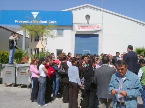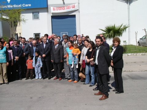 TÜRK-İŞ GENEL BAŞKANI KILIÇ, NOVAMED GREVİNDEKİ ÜYELERİMİZİ ZİYARET ETTİ Konfederasyonumuz Türk-İş’in Genel Başkanı Salih Kılıç, Türk-İş Genel Mali Sekreteri Ergün Atalay, Genel Başkanımız Mustafa Öztaşkın ve Türk-İş’e bağlı sendikaların Antalya şube başkanları ve yöneticileriyle birlikte Antalya Serbest Bölgesi’ndeki Novamed grevinde 194’üncü günlerini dolduran üyelerimizi ziyaret ederek maddi destekte ve yiyecek yardımında bulundu. Novamed işyerinde greve çıkan 84 üyemizden 82’sini kadın üyeler oluşturuyor.Kılıç, burada yaptığı konuşmada, çok uluslu Alman sermayeli Fresenius Medikal Care’e (FMC) bağlı Novamed işverenini eleştirdi. Çalışanların amacının ‘bağcıyı dövmek” olmadığını, sadece ”üzüm yemek” olduğunu belirten Kılıç, şunları söyledi:”Çalışma yaşamında kadınlara zulüm devam ediyor. İnsan Hakları Evrensel Beyannamesi’nin 21. maddesine aykırı davrananları kınıyorum. Toplu sözleşme düzeni ve sendikal hak ve özgürlüklerin yerine getirilmesi için Avrupa Sosyal Şartı’na imza koyan Almanya hükümetinin, İtalya hükümetinin, Türkiye’ye gelmiş olan bu sermayeye, dikkatini çekecek bir manifesto göndermesini dilerim.Türkiye’de, Avrupa Sosyal Şartı’nın gereğinin yerine getirilmesini isteyenler, önce kendi şirketlerinde bunun gereğini uygulamalıdırlar.” Türk-İş Genel Başkanı Salih Kılıç, tutumunu 24 Mayısta yapılacak Avrupa Sendikalar Birliği (ETUC) İcra Kurulu toplantısında gündeme getireceği işvereni, Avrupa Sendikalar Konfederasyonuna da (ICEFTU) şikayet edeceğini bildirdi.Önkoşulsuz anlaşmaya hazırızSendikamız Genel Başkanı Mustafa Öztaşkın da işverenin sendikayı tanıması ve sözleşmeye oturması halinde ön koşulsuz anlaşmaya hazır olduklarını söyledi. İşverenin çalışanlara ve işçilere çeşitli baskılar yaptığını söyleyen Öztaşkın, ”Bu işletmeyi satacaklarını söylüyorlar. Satacaksanız satın, kapatacaksanız kapatın. Ama işçiler, bu grevi başarıyla sonuçlandıracaktır” dedi. Konuşmaların ardından Kılıç, işçilere 200’er YTL ve yiyecek yardımında bulundu. Grevci üyelerimiz de Türk-İş Başkanı Kılıç’a desteklerinden dolayı teşekkür etti.