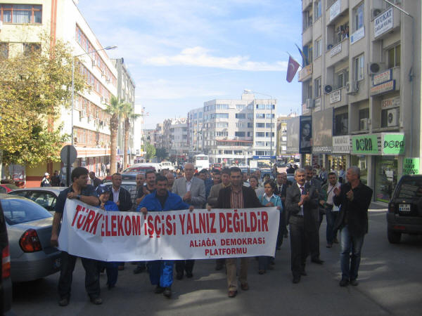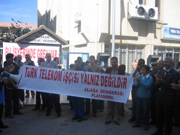 Türk Telekom işçilerine destek ziyareti 19.10.2007Türk Haber-İş Sendikası ile Türk Telekom yetkilileri arasında yürütülen Toplu İş Sözleşmesinde anlaşmazlıkla sonuçlanmasından dolayı Türk Haber-İş Sendikası 25 Bin 680 üyesi ile 16 Ekim 2007 tarihinde Greve çıkmıştır. Biz de Petrol-İş olarak Aliağa Demokrasi Platformu ile birlikte Türk Telekom işçilerine destek ziyaretinde bulunduk.