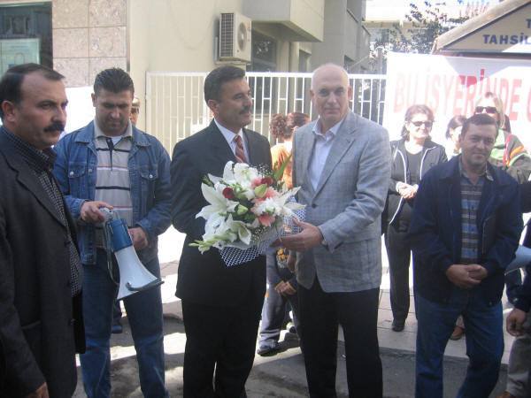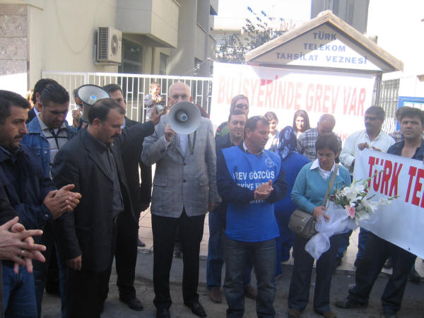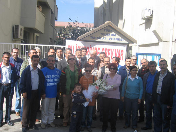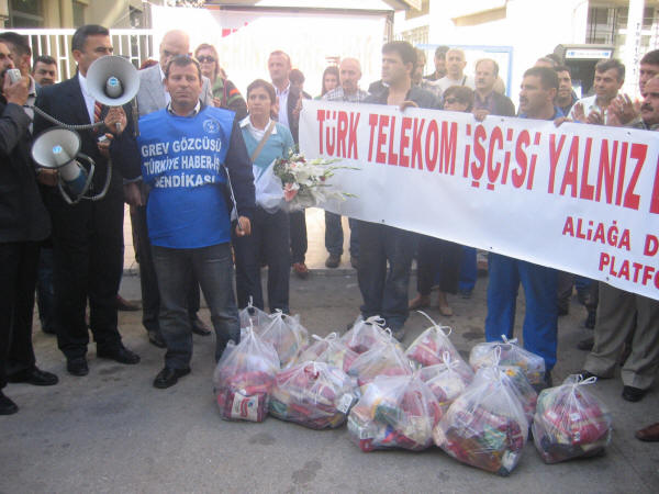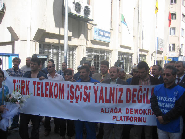 Türk Telekom işçilerine destek ziyareti 19.10.2007Türk Haber-İş Sendikası ile Türk Telekom yetkilileri arasında yürütülen Toplu İş Sözleşmesinde anlaşmazlıkla sonuçlanmasından dolayı Türk Haber-İş Sendikası 25 Bin 680 üyesi ile 16 Ekim 2007 tarihinde Greve çıkmıştır. Biz de Petrol-İş olarak Aliağa Demokrasi Platformu ile birlikte Türk Telekom işçilerine destek ziyaretinde bulunduk. Türk Haber-İş İzmir Şube Başkanı Kemal İLÇEOĞLU işçilere hitaben yaptığı konuşmada “Hükümetin yabancı sermayeye tanıdığı sınırsız özgürlüğün, bugün hem işçi sınıfını hem de ulusal kaynakları fütursuzca sömürmektedir ” dedi. Ayrıca işverenin aynı işi yapan sendikalı ve sendikasız işçi arasında adaletsiz bir ücret sistemi uygulayarak, Türk Telekom’da sendikanın etkinliğini zaman içinde yok etmek istemektedir. Başkan Türk Telekom yetkilileri tarafından gündeme getirilen sabotaj olayı ile ilgilide hiçbir Türk Haber-İş üyesi çalışanının asla böyle bir eylemde ve davranışta bulunamayacağını, hala % 45’i Kamu da olan Türk Telekom için işçilerimiz her zaman büyük fedakarlık ve özveri ile çalışmıştır, çalışmaya da devam edecektir. Bu itham için işvereni de şiddetle kınadıklarını ve bu grevin ancak sendikanın taleplerinin karşılanması ile bitebileceği konusunda kararlı olduklarını söyledi.Söz alan Petrol-iş Aliağa Şube Başkanı Salih Mehmet AYDIN, bu grevin yalnızca Haber-İş sendikasının değil ülkede ki tüm sendikaların ve işçi sınıfının onur mücadelesidir dedi. 4857 sayılı iş yasası ile Hükümetler sermayeye sınırsız haklar tanımıştır. Sermaye bu haklardan güç alarak işçi sınıfı ve örgütlenme üzerinde her türlü baskıyı yapmaktadır. Bu baskılar ancak işçi sınıfının mutat mücadelesi ile savuşturulabilir. Sendikalara düşen görev sermayenin saldırıları karşısında ortak mücadele etmektir. Daha dün Petkim’de Petrol-İş, Hava Yollarında Hava-İş bu mücadeleyi vererek, kazanımlar elde etmiştir. İnanıyorum ki Haber-İş sendikamız da tüm üyeleri ile birlik olarak bu mücadeleden kazançla çıkacaktır. Bizim üzerimize düşen görev sendikalar olarak işçisi ile memuru ile Haber-İş sendikamızın haklı mücadelesinin yanında olmaktır. Tarih göstermiştir ki”direnenler hep kazanmamıştır, ama kazananlar hep direnenler olmuştur”. Tekrar Haber-İş sendikamızın bu haklı grevi karşısında saygı ile eğiliyor ve mücadelelerinde başarılar diliyoruz.