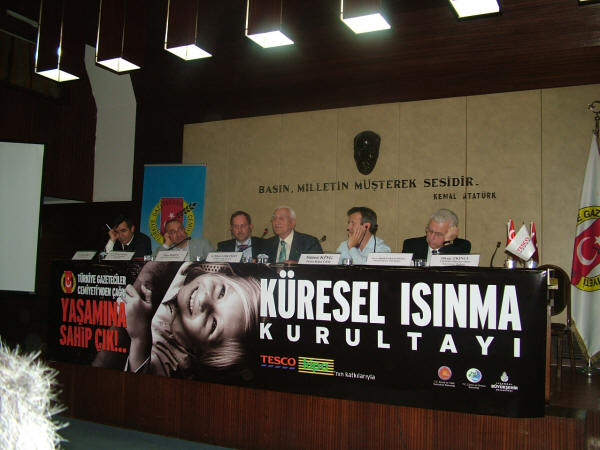 “YAŞAMINA SAHİP ÇIK” TEMASIYLA GERÇEKLEŞEN TGC KÜRESEL ISINMA KURULTAYI: “ABD Kyoto’yu imzalamaz çünkü dünyaya yılda 5.5 milyar ton karbon salıyor ” Türkiye Gazeteciler Cemiyeti (TGC) tarafından, tüm kesimlerin ortak bir paydada buluşması hedefiyle düzenlediği Küresel Isınma Kurultayı, 7 Mayıs Çarşamba günü, TGC’nin Cağaloğlu merkezinde yer alan Burhan Felek Konferans Salonu’nda yapıldı. TGC Başkanı Orhan Erinç, Çevre ve Orman Bakanı Veysel Eroğlu ve TESCO Kipa İcra Kurulu Başkanı Simon King’in açılış konuşmaları ile başlayan Kurultay panel ve forumlarla sürdü.