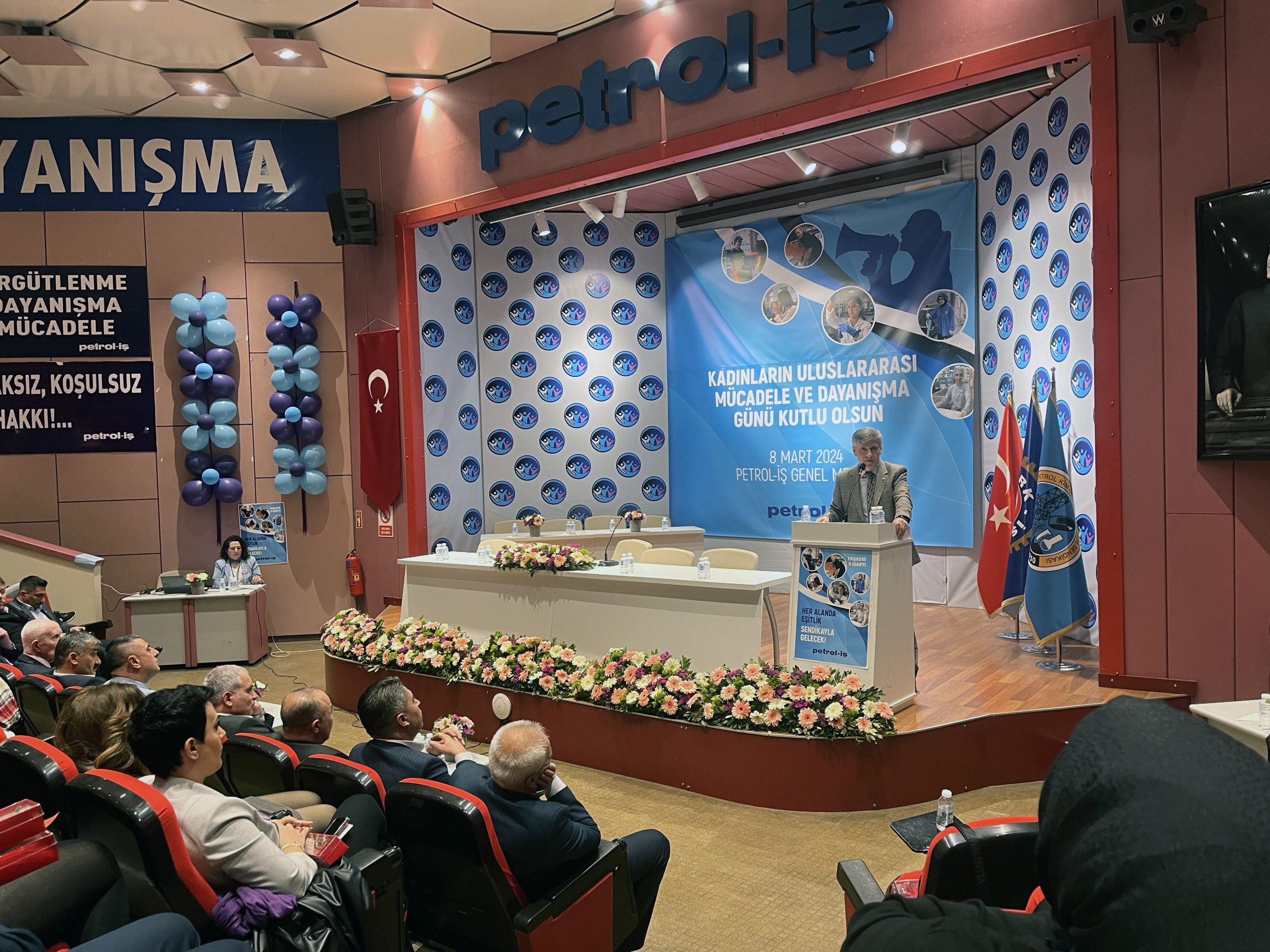 Genel Başkan Akyüz konuşmasına bu seneki 8 Mart’ta Petrol-İş’in şiarının “Her alanda eşitlik sendikayla gelecek” olduğunu belirterek başladı. Sendikal örgütlülük ve kadın mücadelesinin ortak yürütülmesi gerektiğine dikkat çeken Akyüz, “Örgütsüz işyerlerinde çalışan kadınların tek sorunu düşük ücretler değil. Bu işyerlerinde kişilik haklarına, kadınlık onuruna yönelik saldırılar da söz konusu. Şiddet, mobbing, ayrımcılık her türlü baskı var. Kadınlar hakkını aramaya ve sendikalaşmaya karar verdiklerinde uğradıkları zulmü biliyoruz. Bu mücadele hiç bitmeyecek, her işyerine sendika girinceye dek mücadelemiz sürecek.” dedi.