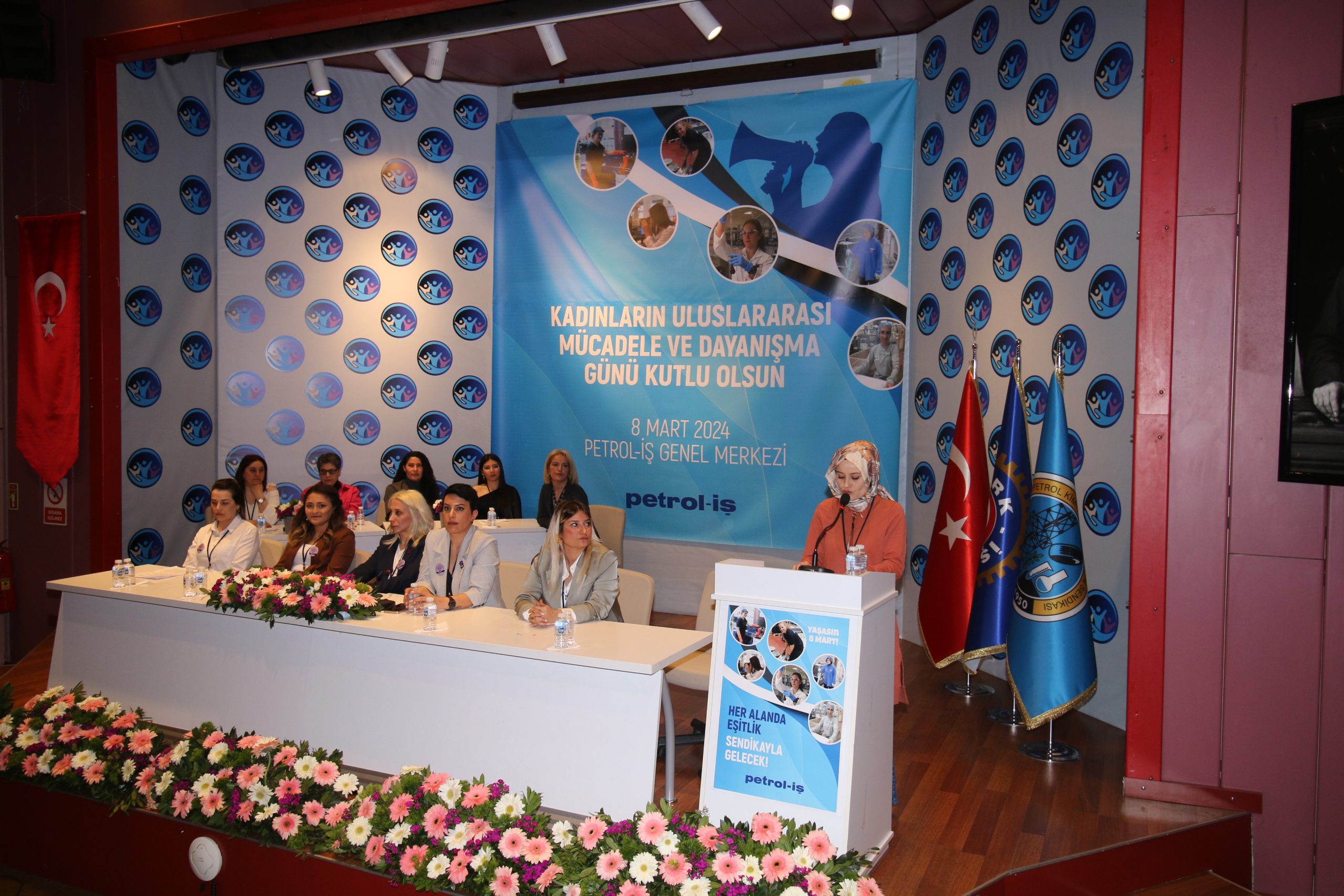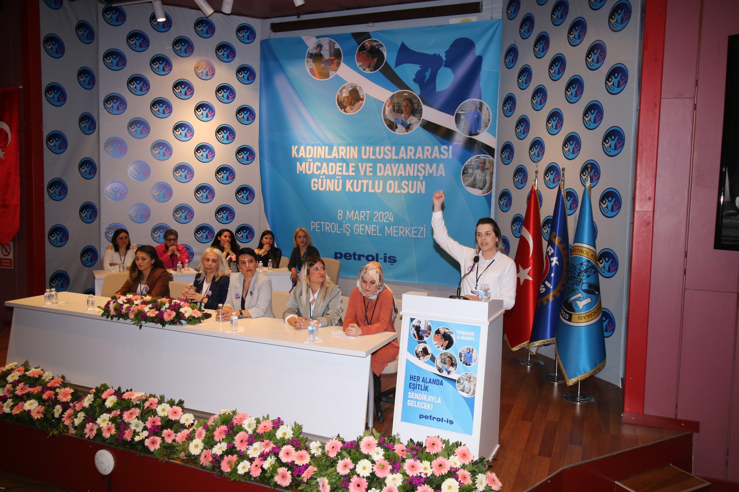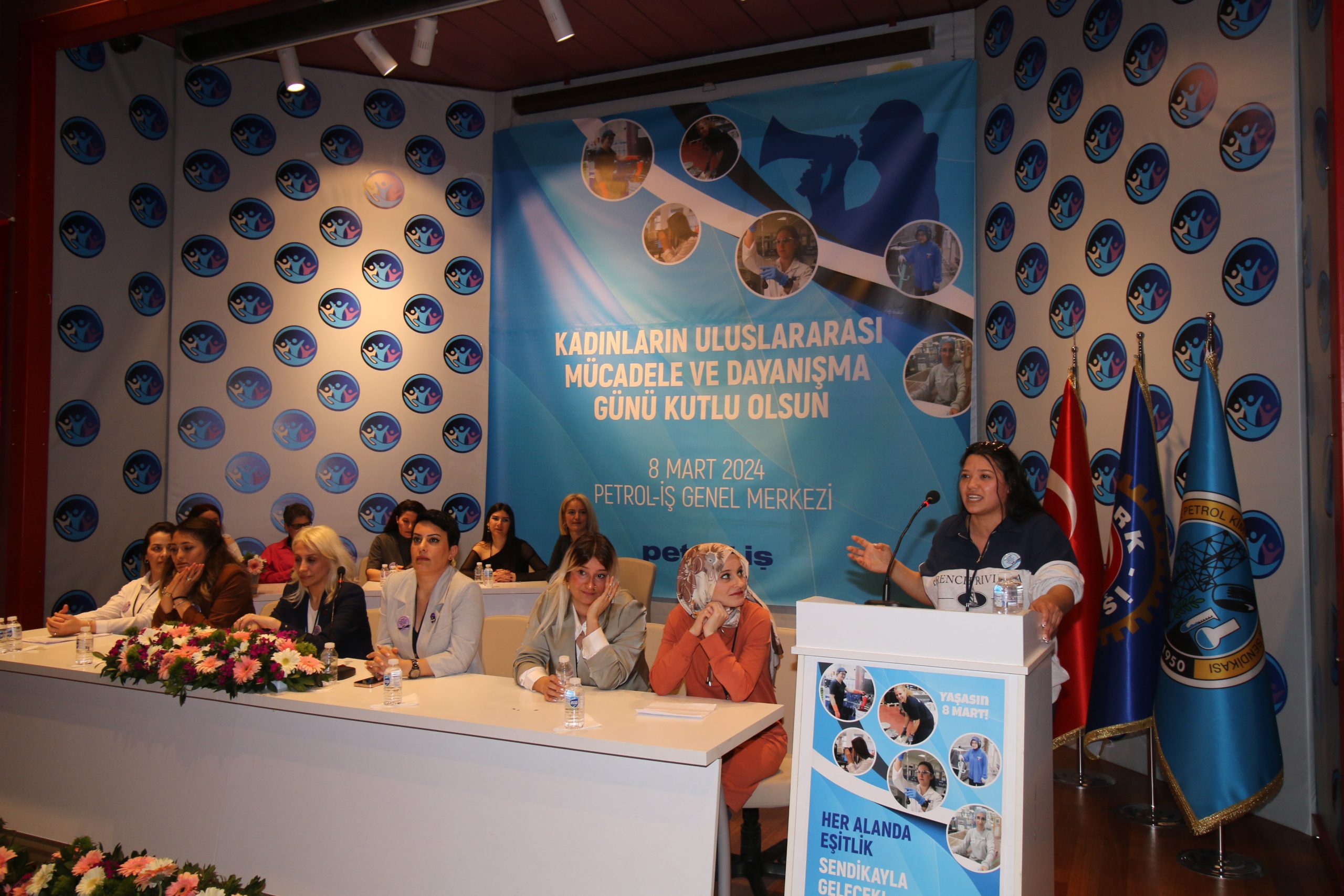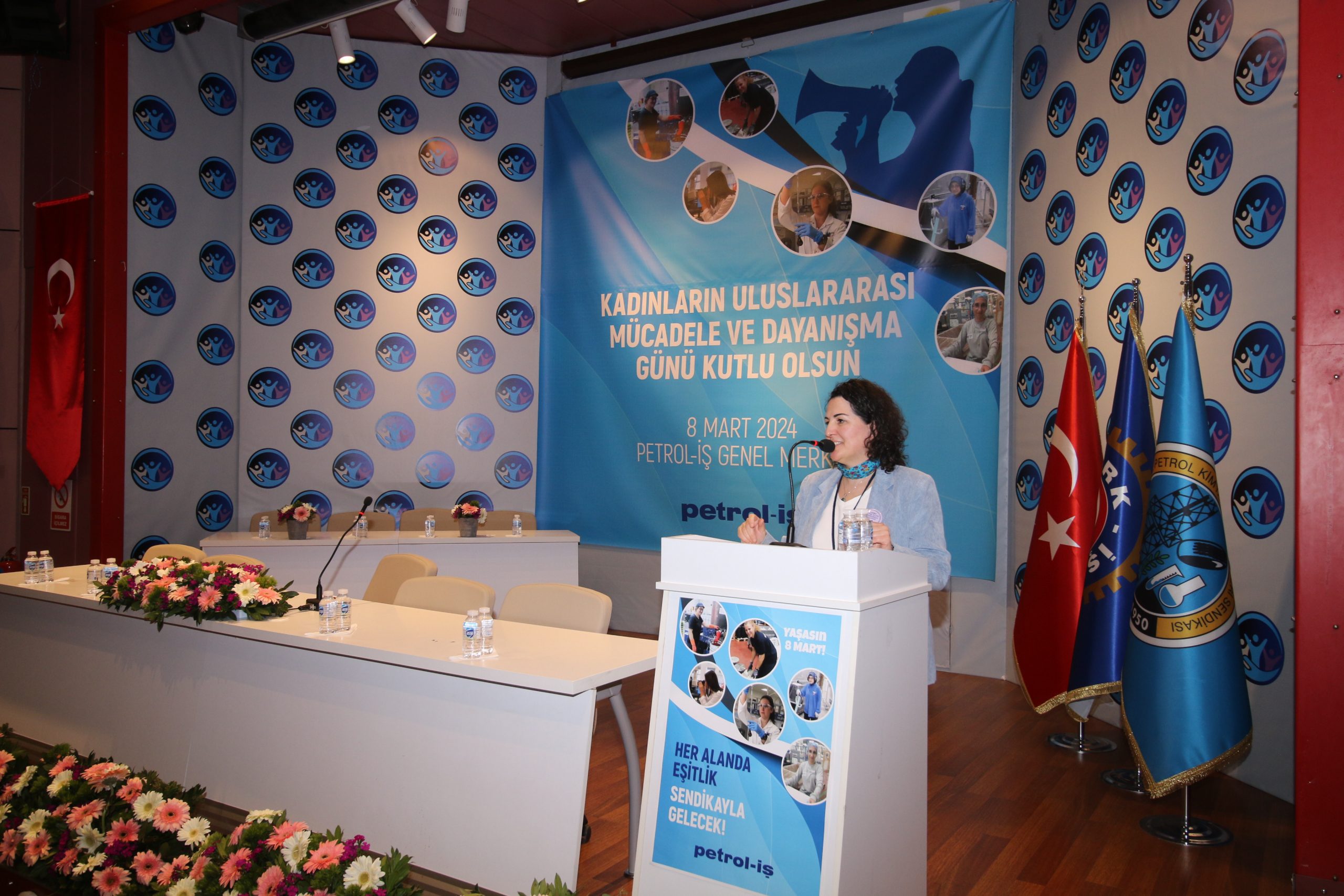 Konuşmasının devamında, “Bir sendika, kadın üyelerini sadece 8 Mart’tan 8 Mart’a hatırlıyorsa, onu koruyacak, güçlendirecek toplu sözleşme hükümleri; eşitliği sağlamak ve şiddeti önlemek için tüzük maddeleri, toplumsal cinsiyet eşitliğine yönelik politikaları yoksa; kadın üye oranının azlığını bahane ederek buna yönelik eğitimler, etkinlikler yapmıyorsa 8 Mart’ta söylenen güzel sözlerin, kutlamaların içi boş kalır. Petrol-İş Merkez Yönetimi olarak bugüne dek bunları yerine getirdik, pek çok alanda ilklere imza attık. Bundan sonra daha da geliştirerek bu çabamızı sürdüreceğiz. Sendikalı bir işyerinde çalışmanın, Petrol-İş üyesi olmanın kadın işçiler için ne anlama geldiği, bugün konuşulan konular arasında olacak.” dedi.