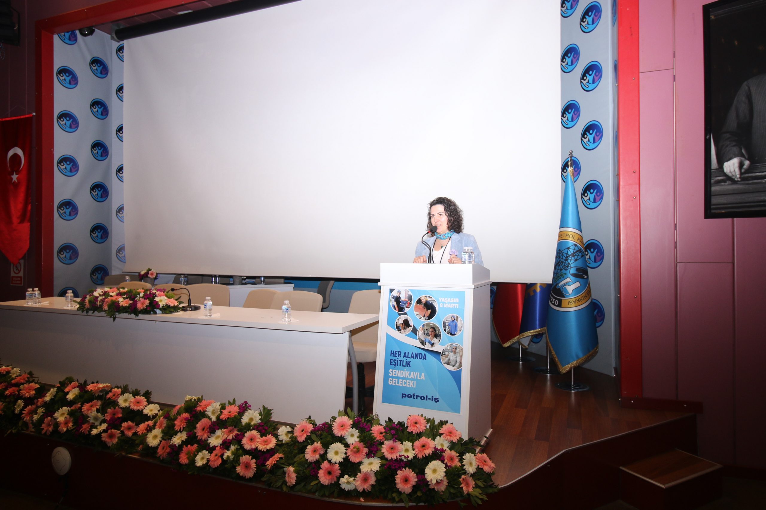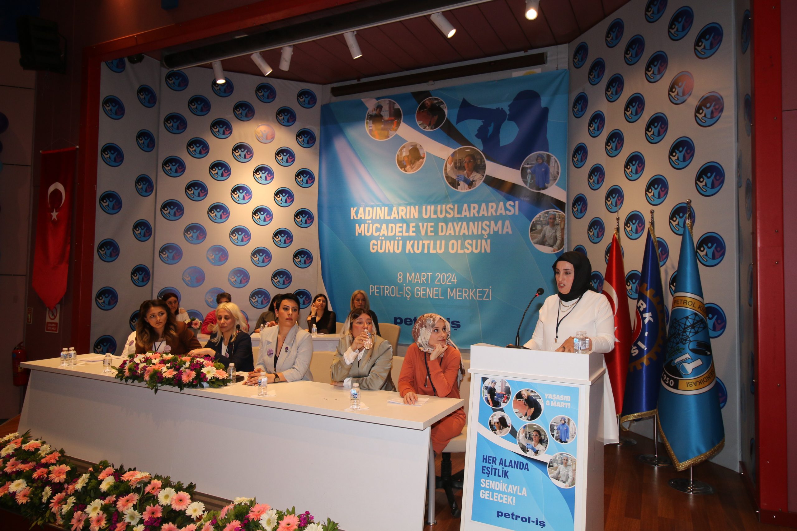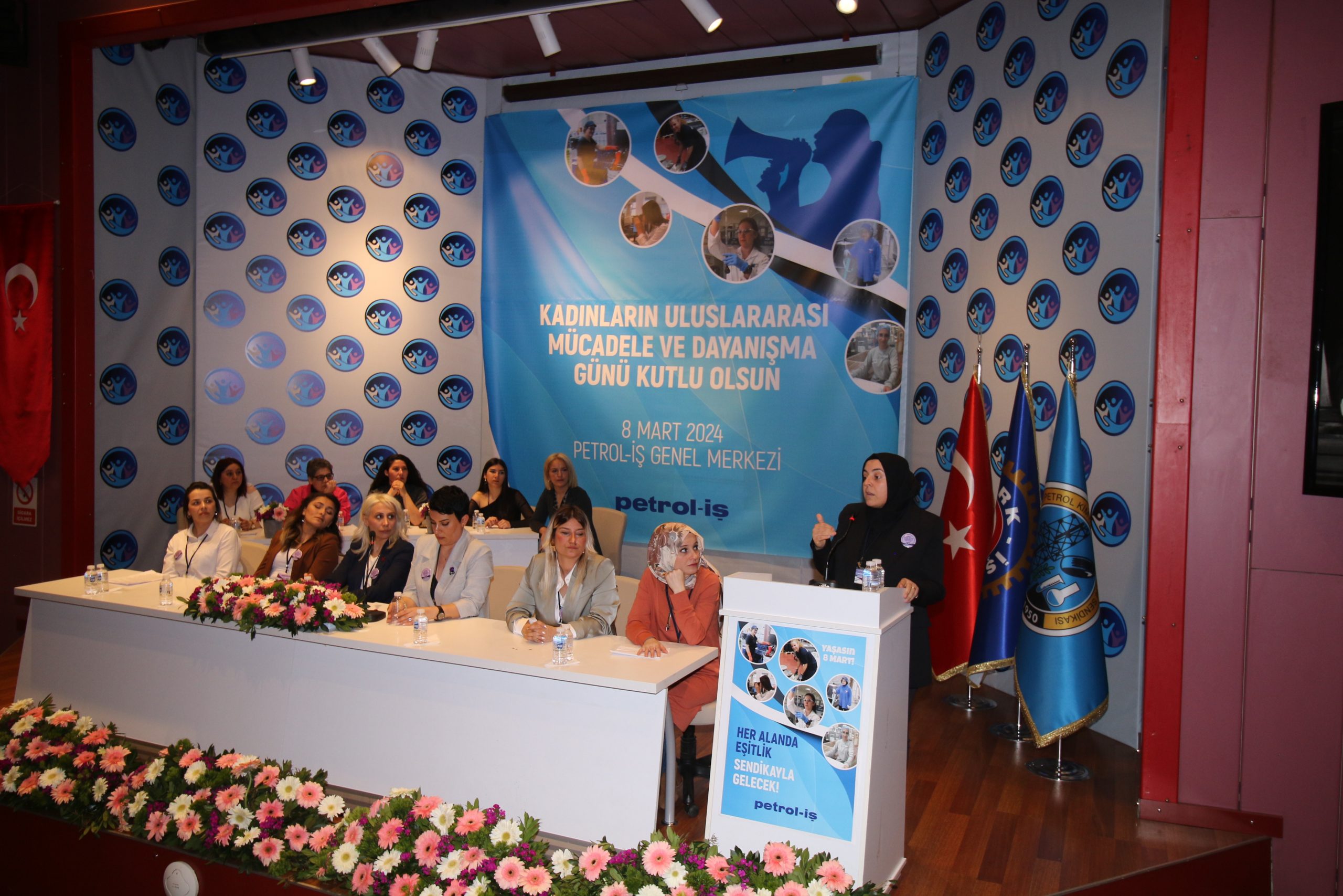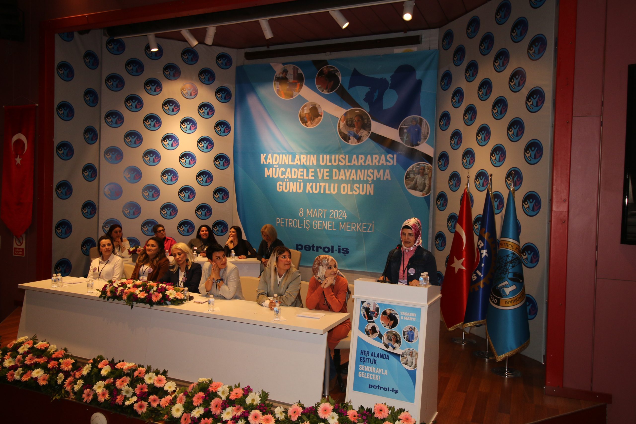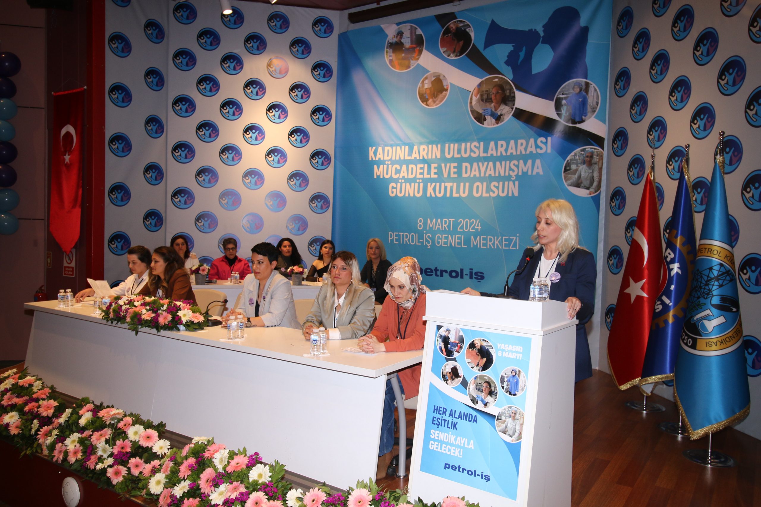 Konuşmasının devamında, “Bir sendika, kadın üyelerini sadece 8 Mart’tan 8 Mart’a hatırlıyorsa, onu koruyacak, güçlendirecek toplu sözleşme hükümleri; eşitliği sağlamak ve şiddeti önlemek için tüzük maddeleri, toplumsal cinsiyet eşitliğine yönelik politikaları yoksa; kadın üye oranının azlığını bahane ederek buna yönelik eğitimler, etkinlikler yapmıyorsa 8 Mart’ta söylenen güzel sözlerin, kutlamaların içi boş kalır. Petrol-İş Merkez Yönetimi olarak bugüne dek bunları yerine getirdik, pek çok alanda ilklere imza attık. Bundan sonra daha da geliştirerek bu çabamızı sürdüreceğiz. Sendikalı bir işyerinde çalışmanın, Petrol-İş üyesi olmanın kadın işçiler için ne anlama geldiği, bugün konuşulan konular arasında olacak.” dedi.