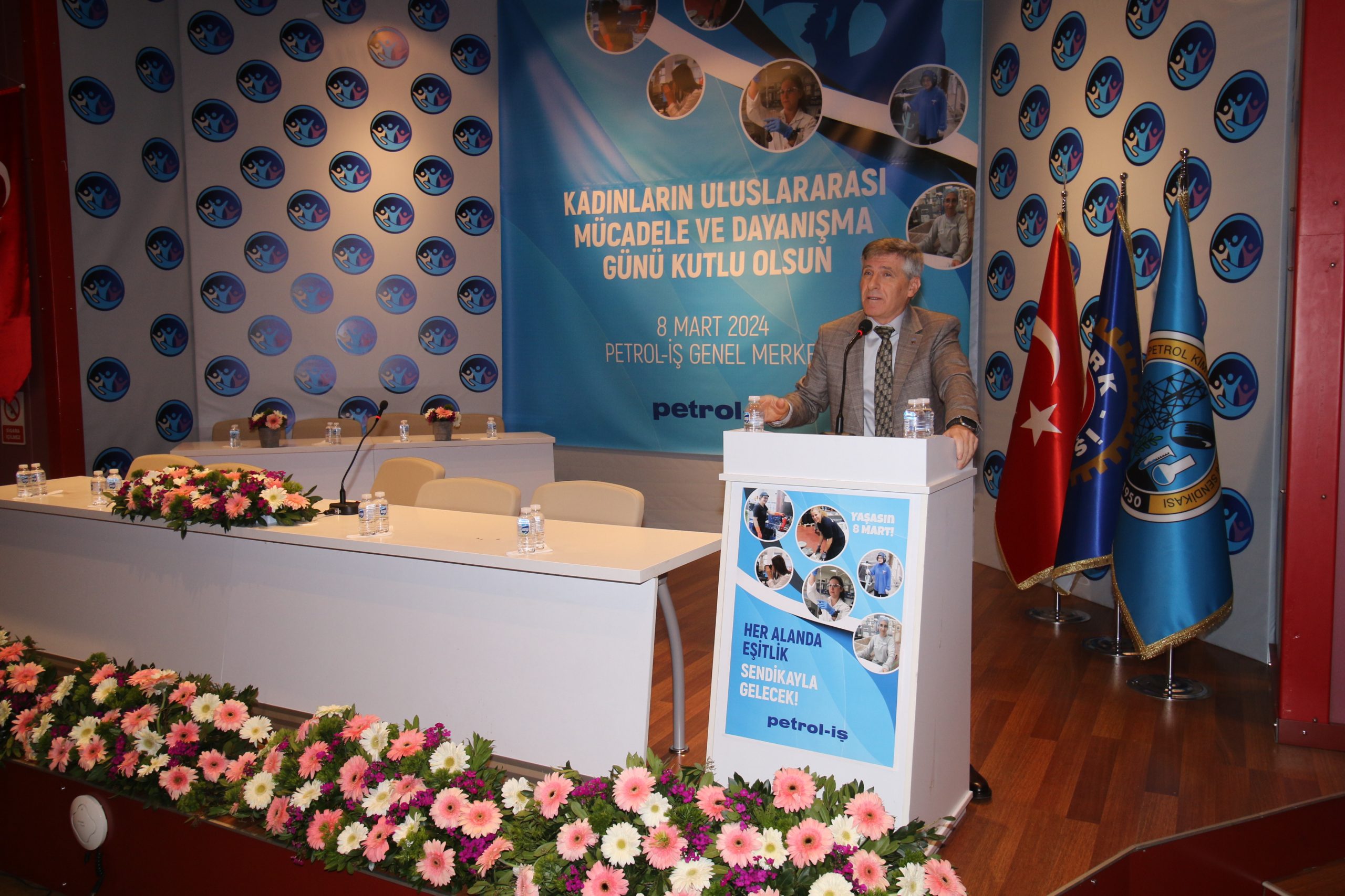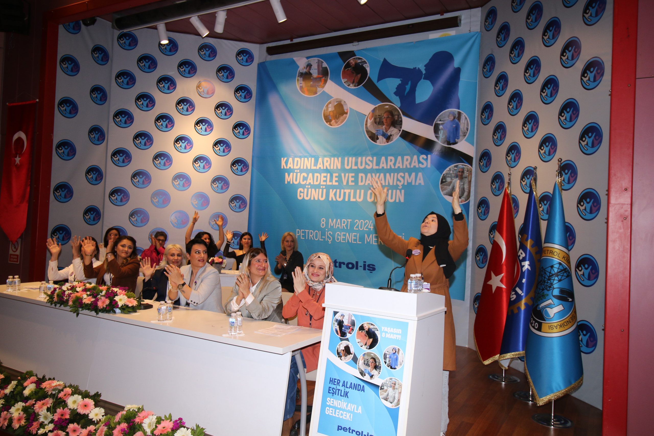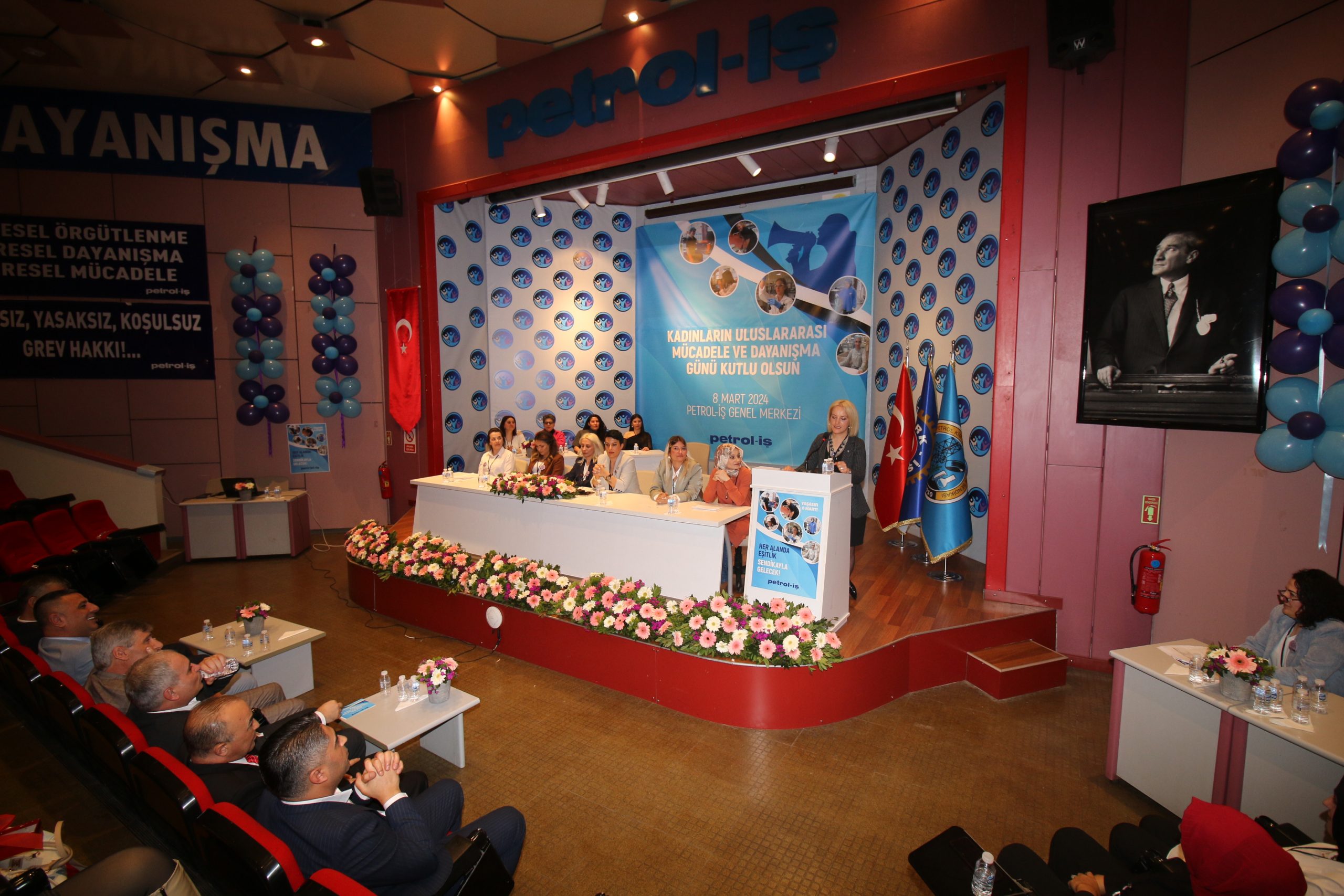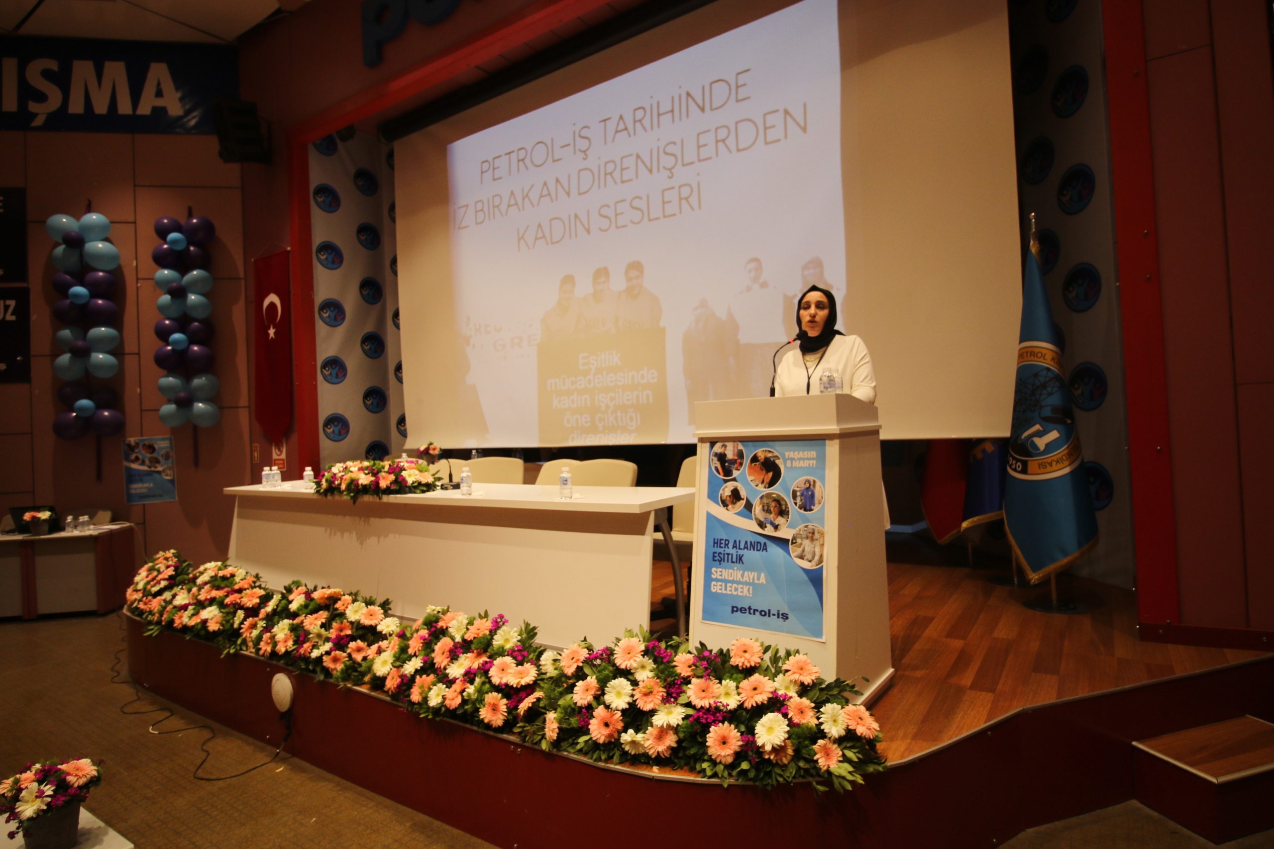 Konuşmasının devamında, “Bir sendika, kadın üyelerini sadece 8 Mart’tan 8 Mart’a hatırlıyorsa, onu koruyacak, güçlendirecek toplu sözleşme hükümleri; eşitliği sağlamak ve şiddeti önlemek için tüzük maddeleri, toplumsal cinsiyet eşitliğine yönelik politikaları yoksa; kadın üye oranının azlığını bahane ederek buna yönelik eğitimler, etkinlikler yapmıyorsa 8 Mart’ta söylenen güzel sözlerin, kutlamaların içi boş kalır. Petrol-İş Merkez Yönetimi olarak bugüne dek bunları yerine getirdik, pek çok alanda ilklere imza attık. Bundan sonra daha da geliştirerek bu çabamızı sürdüreceğiz. Sendikalı bir işyerinde çalışmanın, Petrol-İş üyesi olmanın kadın işçiler için ne anlama geldiği, bugün konuşulan konular arasında olacak.” dedi.