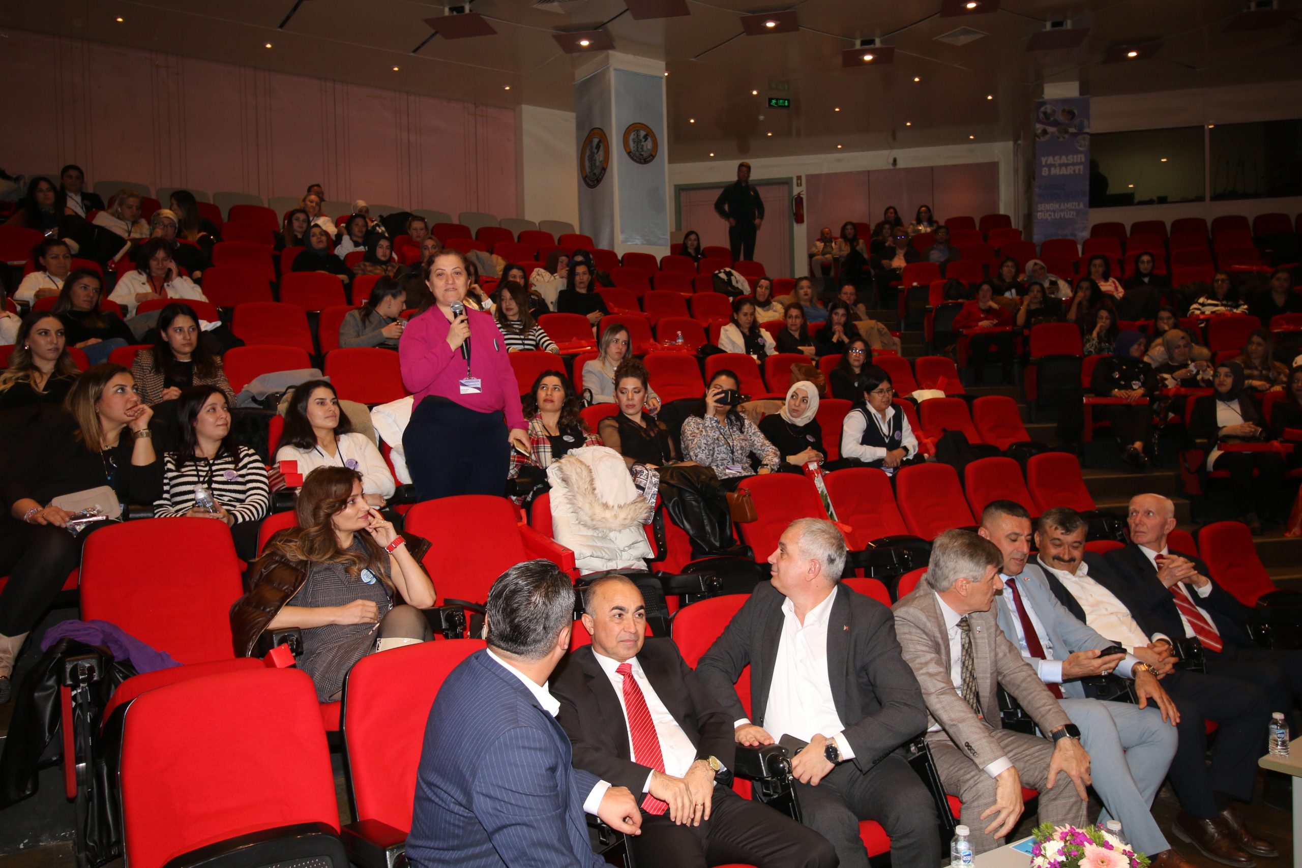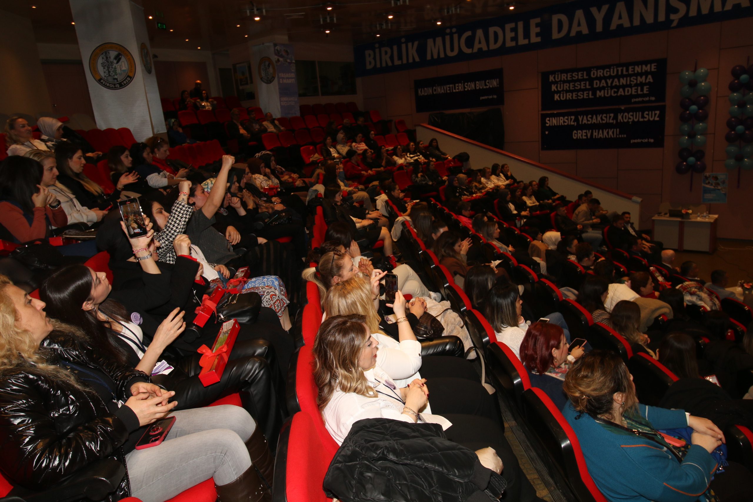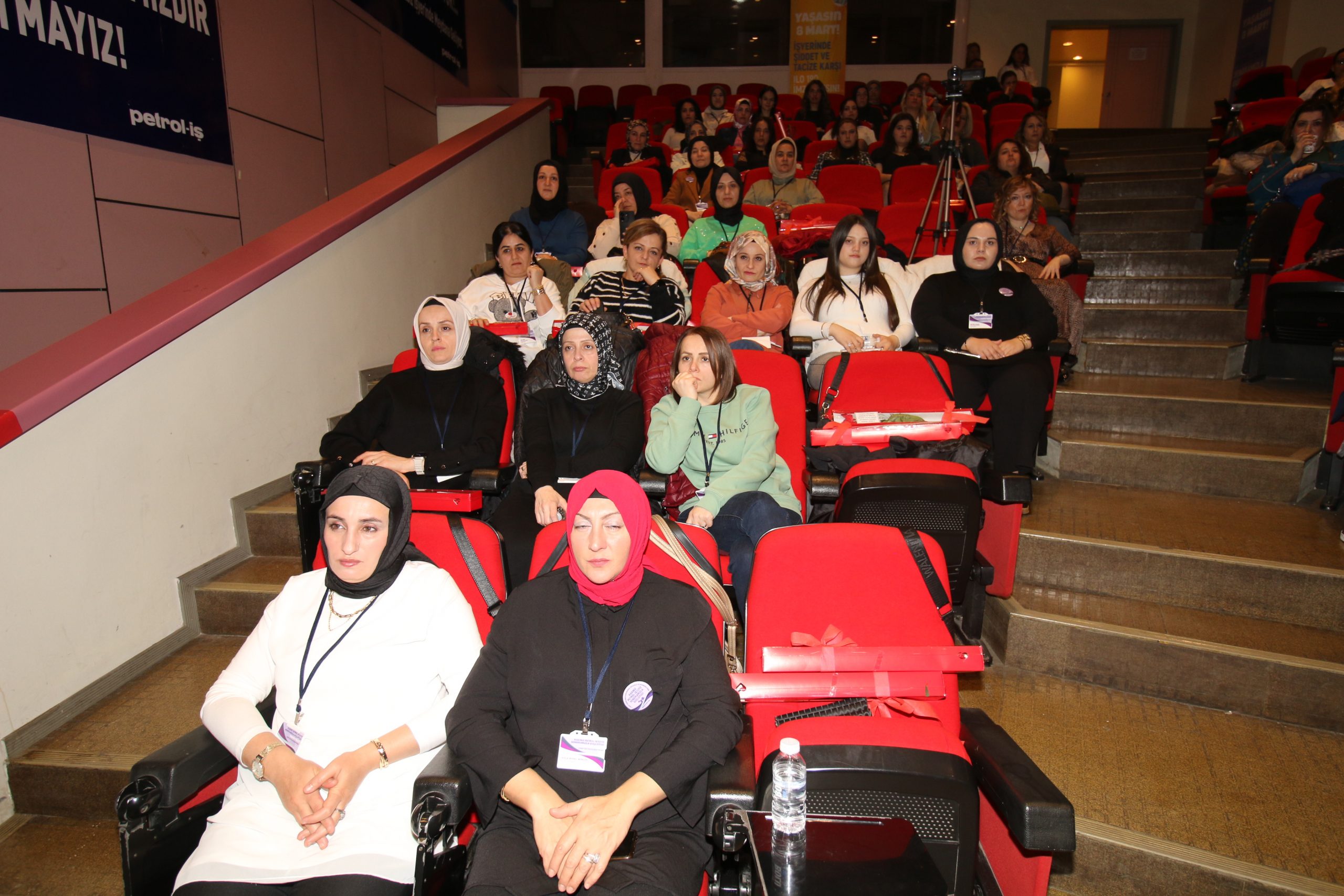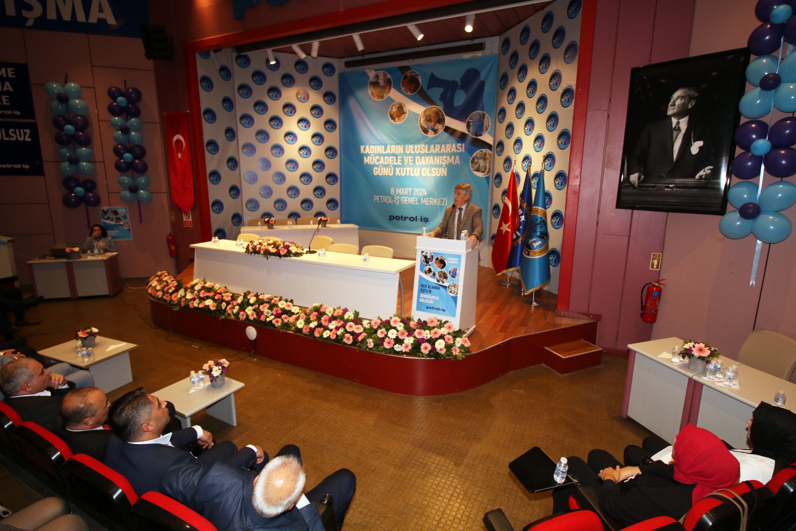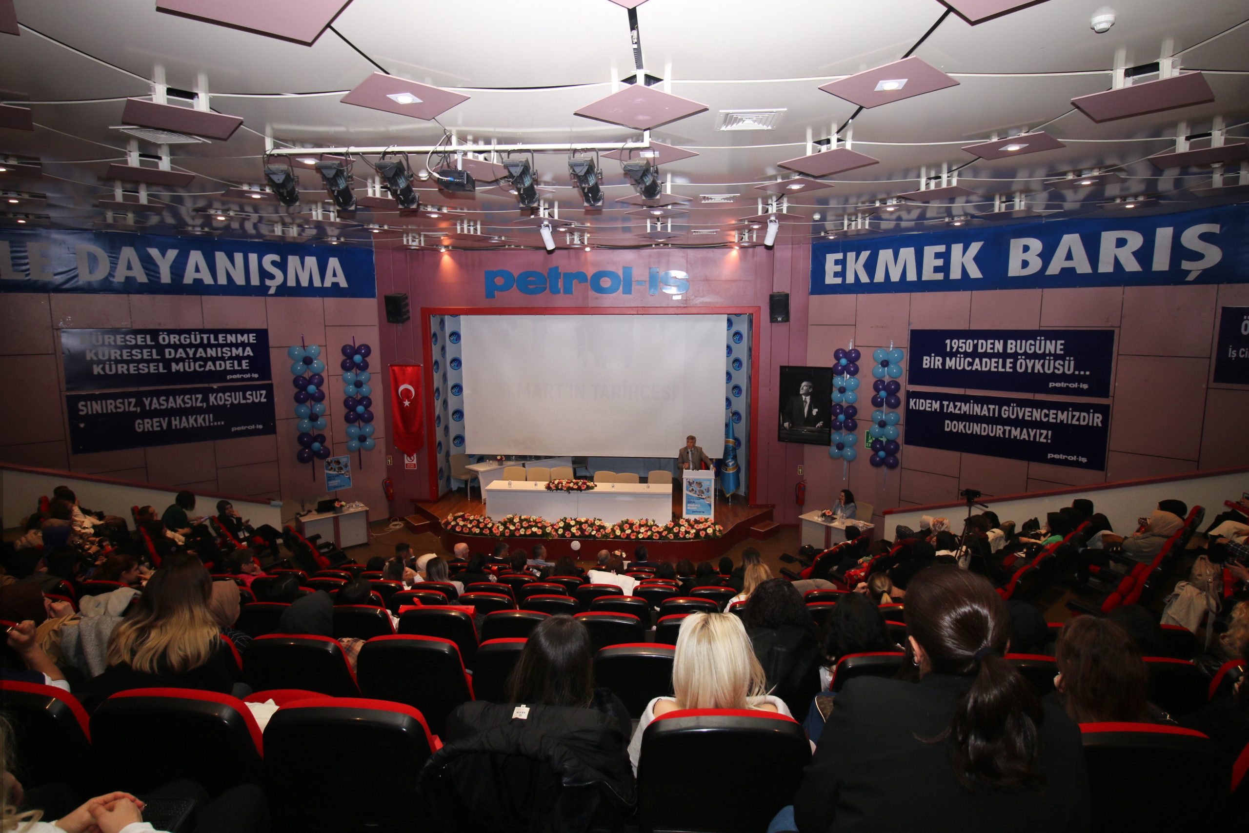 Konuşmasının devamında, “Bir sendika, kadın üyelerini sadece 8 Mart’tan 8 Mart’a hatırlıyorsa, onu koruyacak, güçlendirecek toplu sözleşme hükümleri; eşitliği sağlamak ve şiddeti önlemek için tüzük maddeleri, toplumsal cinsiyet eşitliğine yönelik politikaları yoksa; kadın üye oranının azlığını bahane ederek buna yönelik eğitimler, etkinlikler yapmıyorsa 8 Mart’ta söylenen güzel sözlerin, kutlamaların içi boş kalır. Petrol-İş Merkez Yönetimi olarak bugüne dek bunları yerine getirdik, pek çok alanda ilklere imza attık. Bundan sonra daha da geliştirerek bu çabamızı sürdüreceğiz. Sendikalı bir işyerinde çalışmanın, Petrol-İş üyesi olmanın kadın işçiler için ne anlama geldiği, bugün konuşulan konular arasında olacak.” dedi.