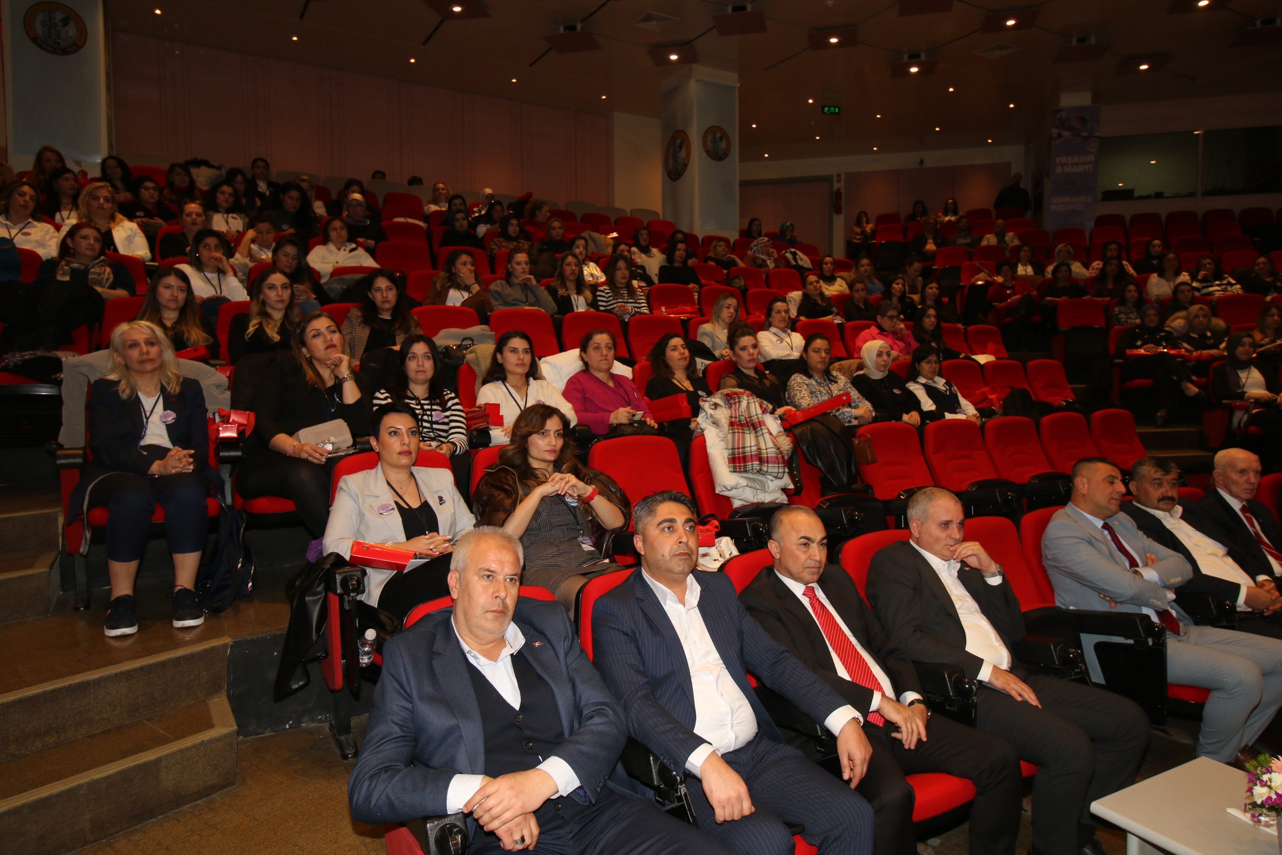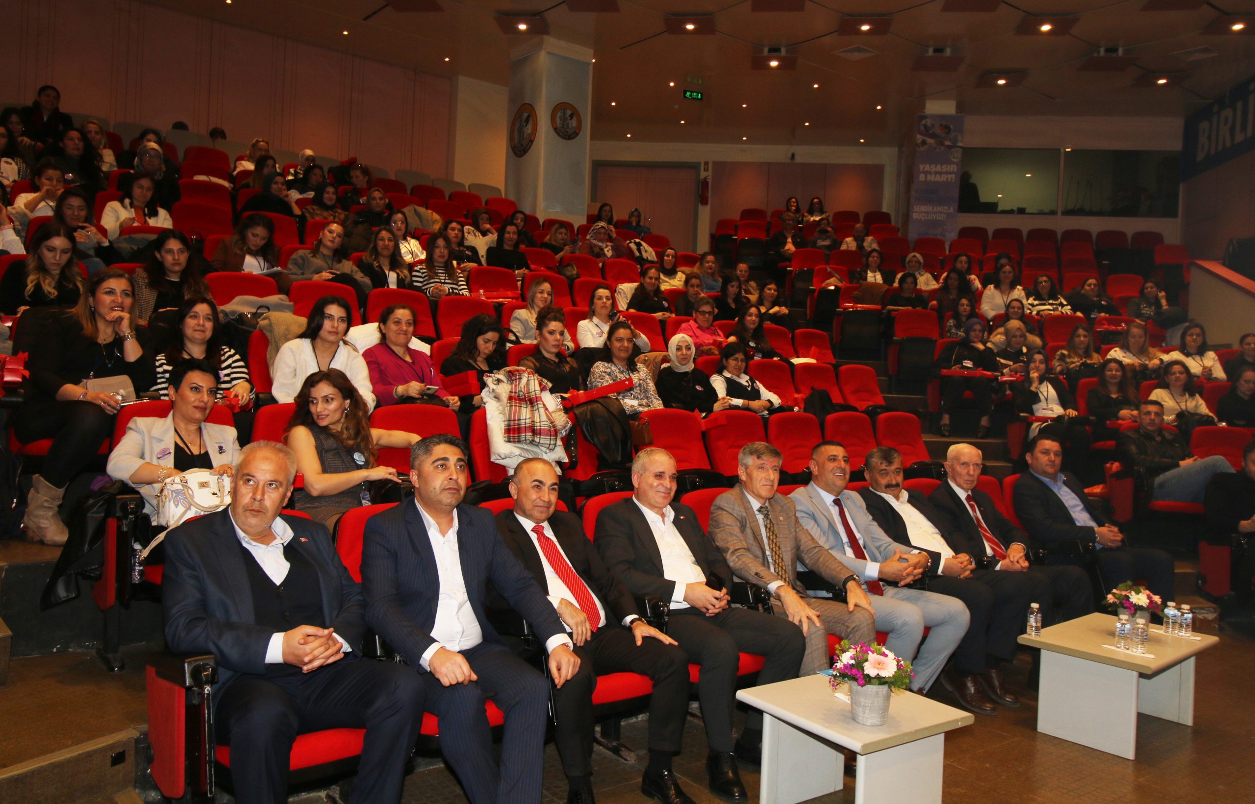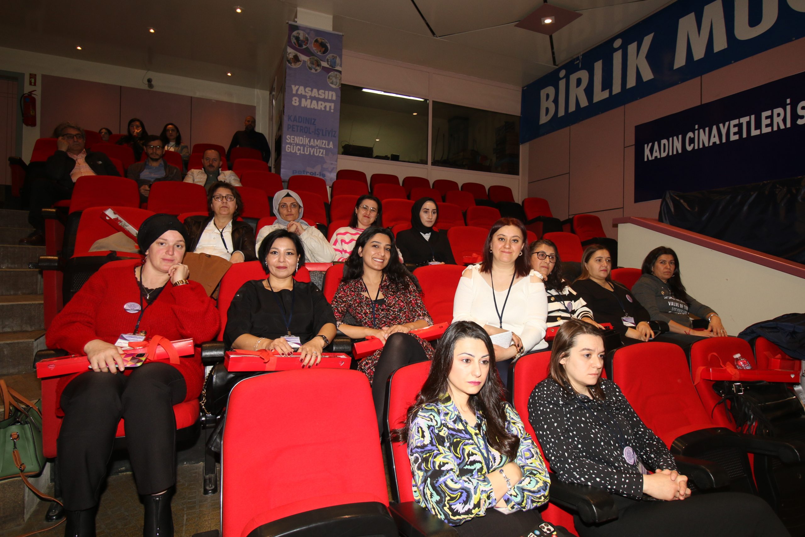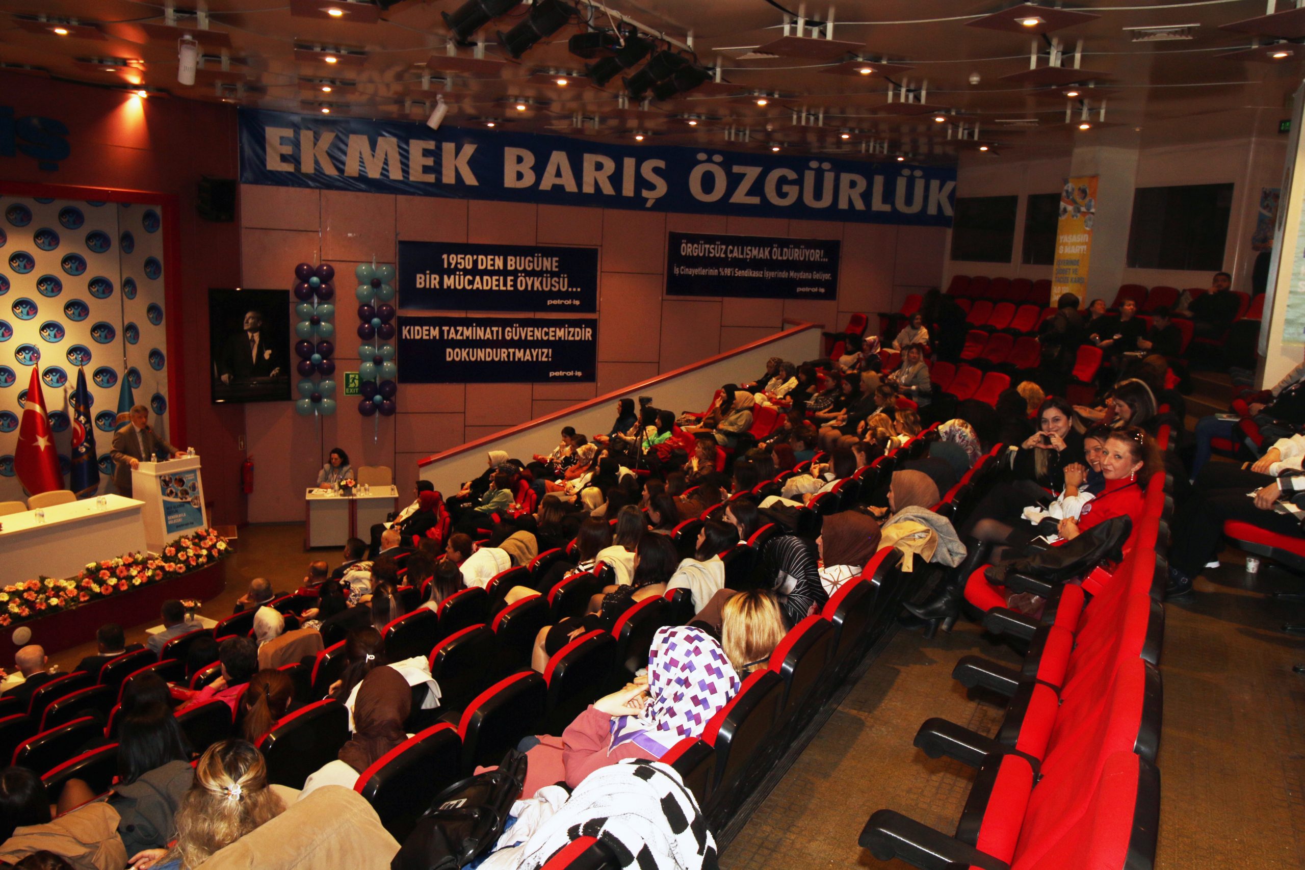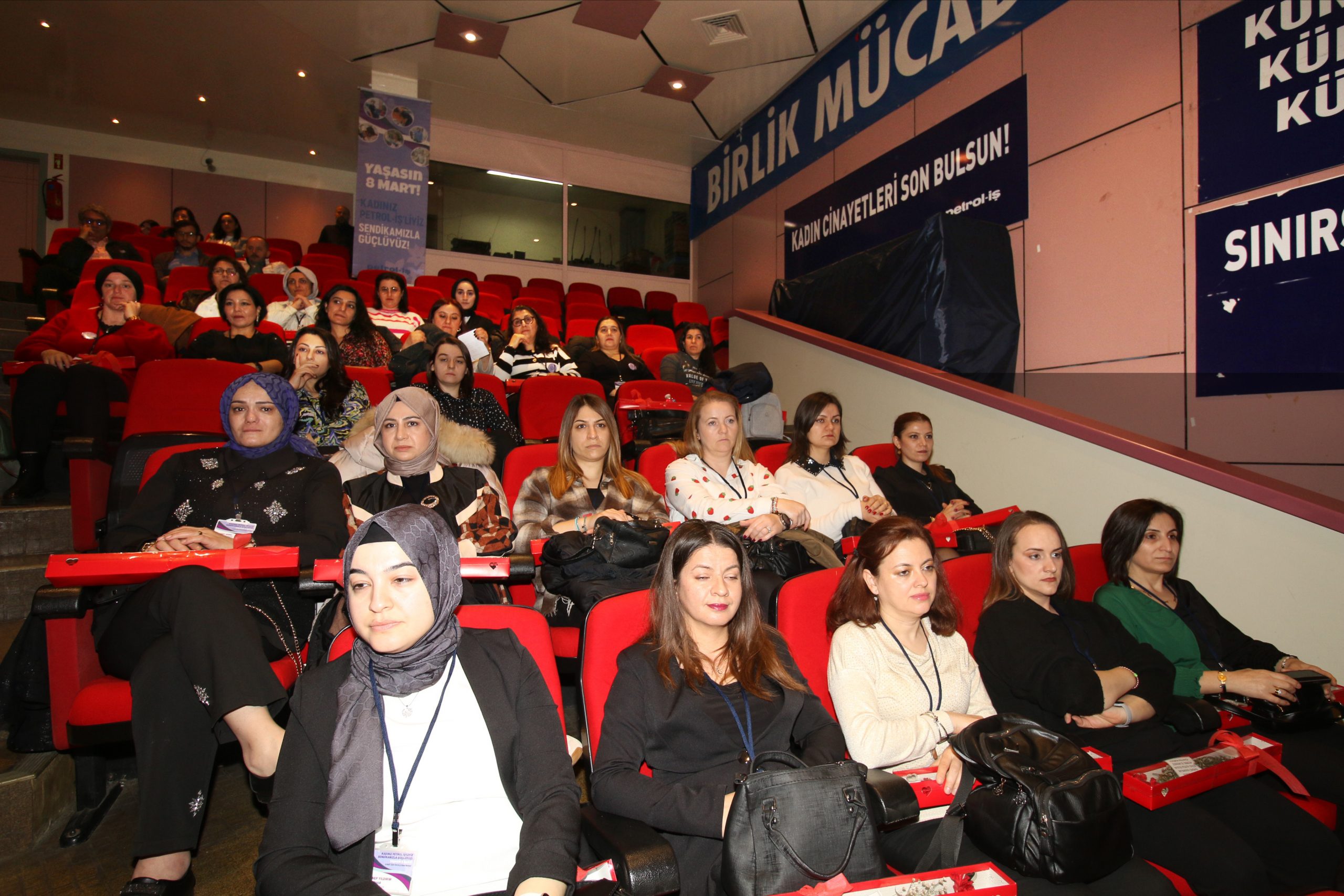 Genel Merkezde yapılan ve sendikamız kadın çalışanlarının da izinli sayılarak katıldığı etkinlikte yaklaşık 200 kişi yer aldı. Sendikamız Genel Merkez Yönetimi de programı takip ederek kadın üyelerimizin sendikal mücadeleye bakışı, çalışma yaşamındaki sorunlarını, sendikadan taleplerini not aldı.