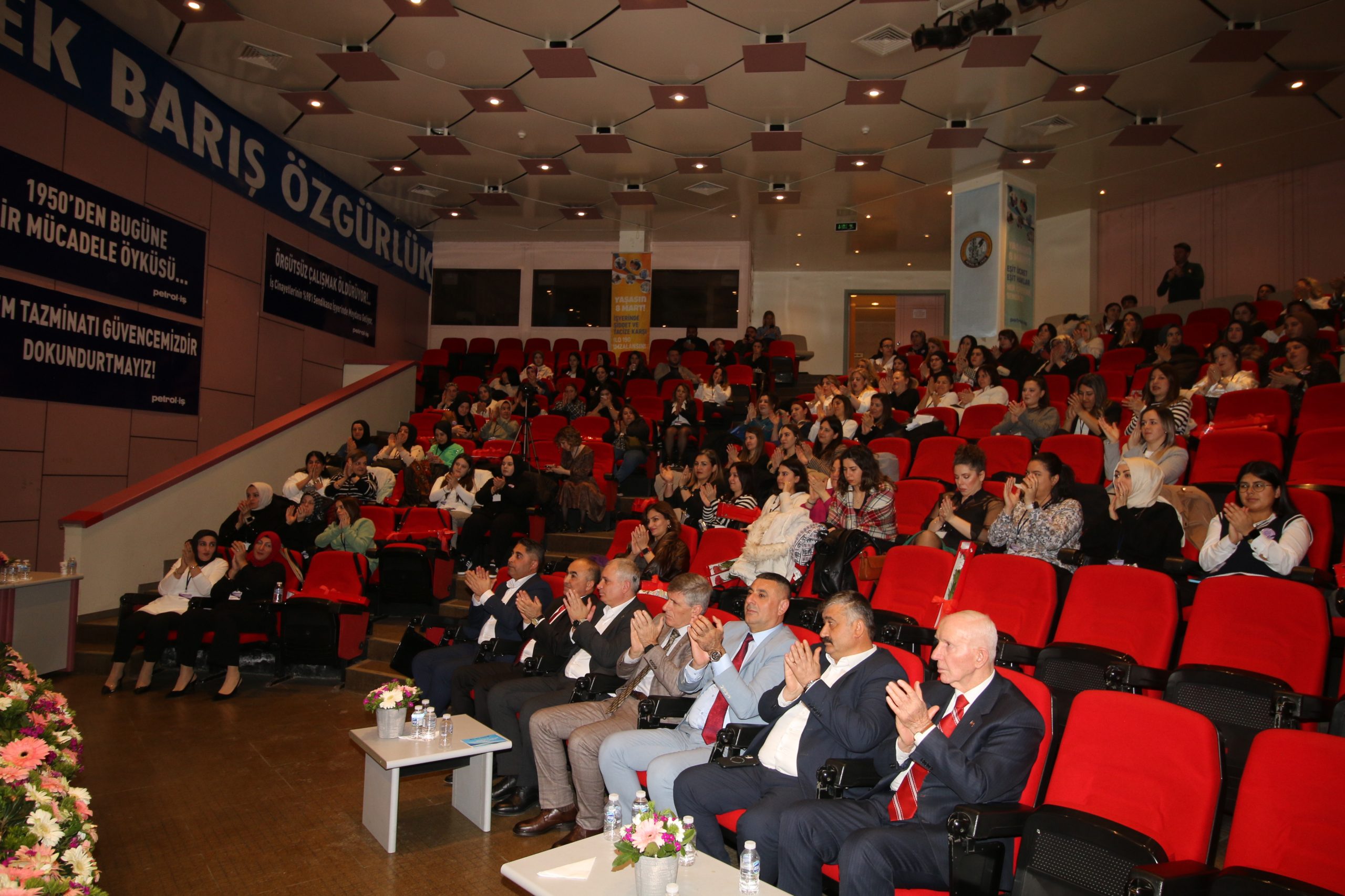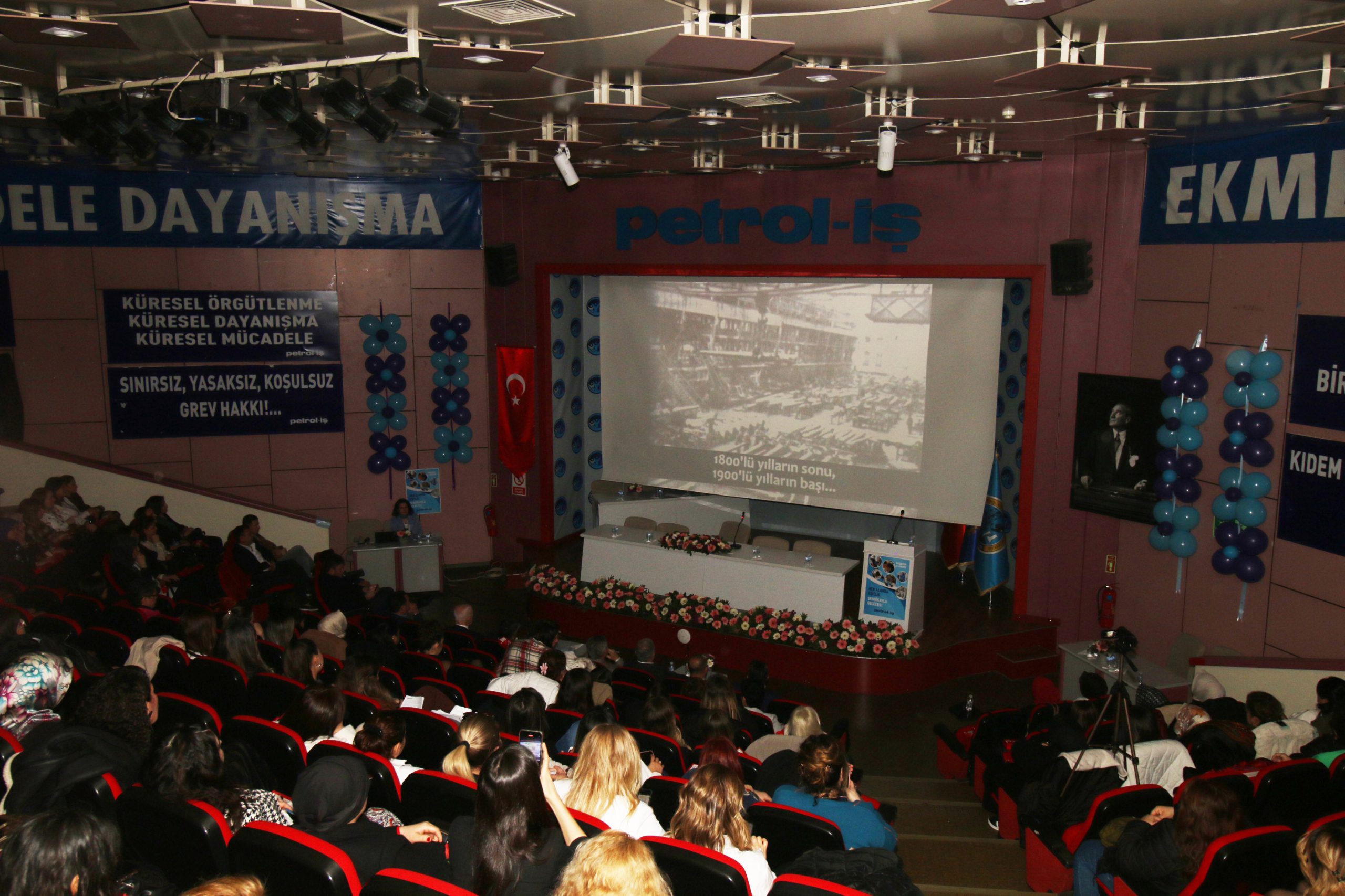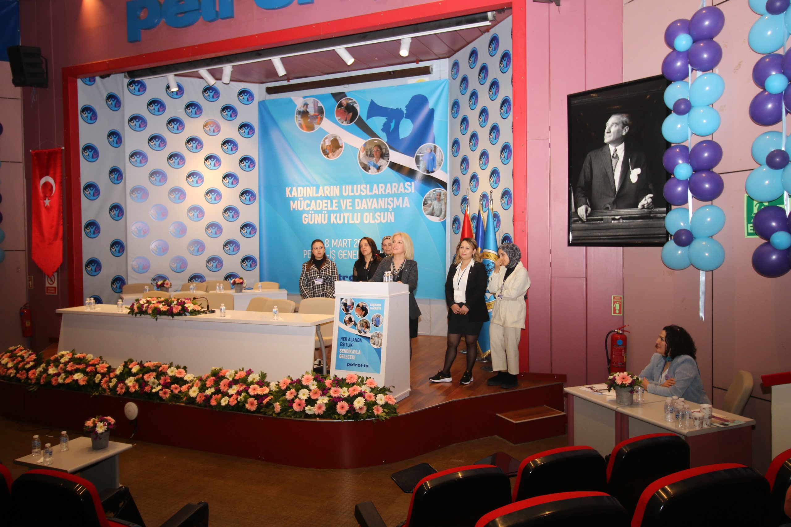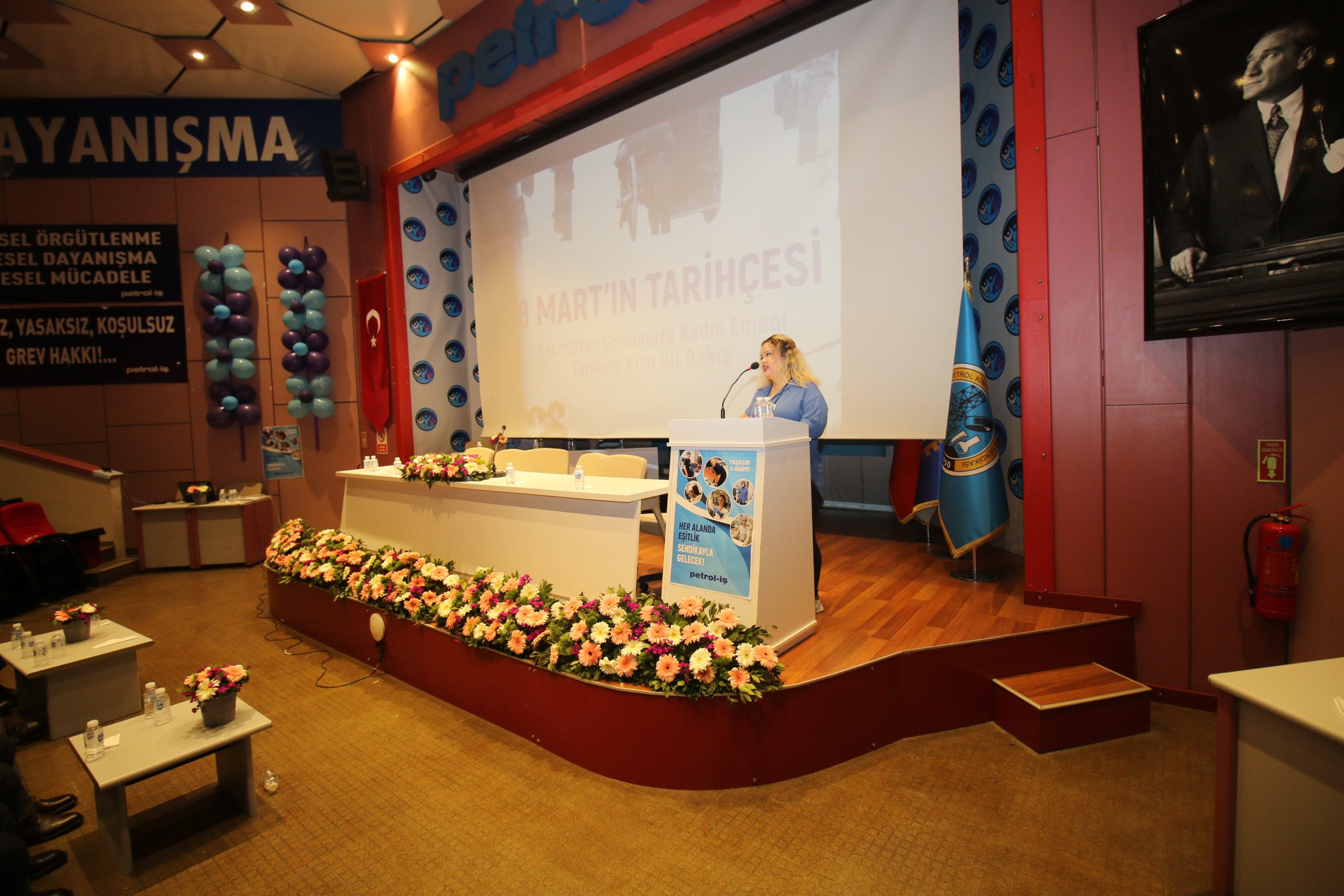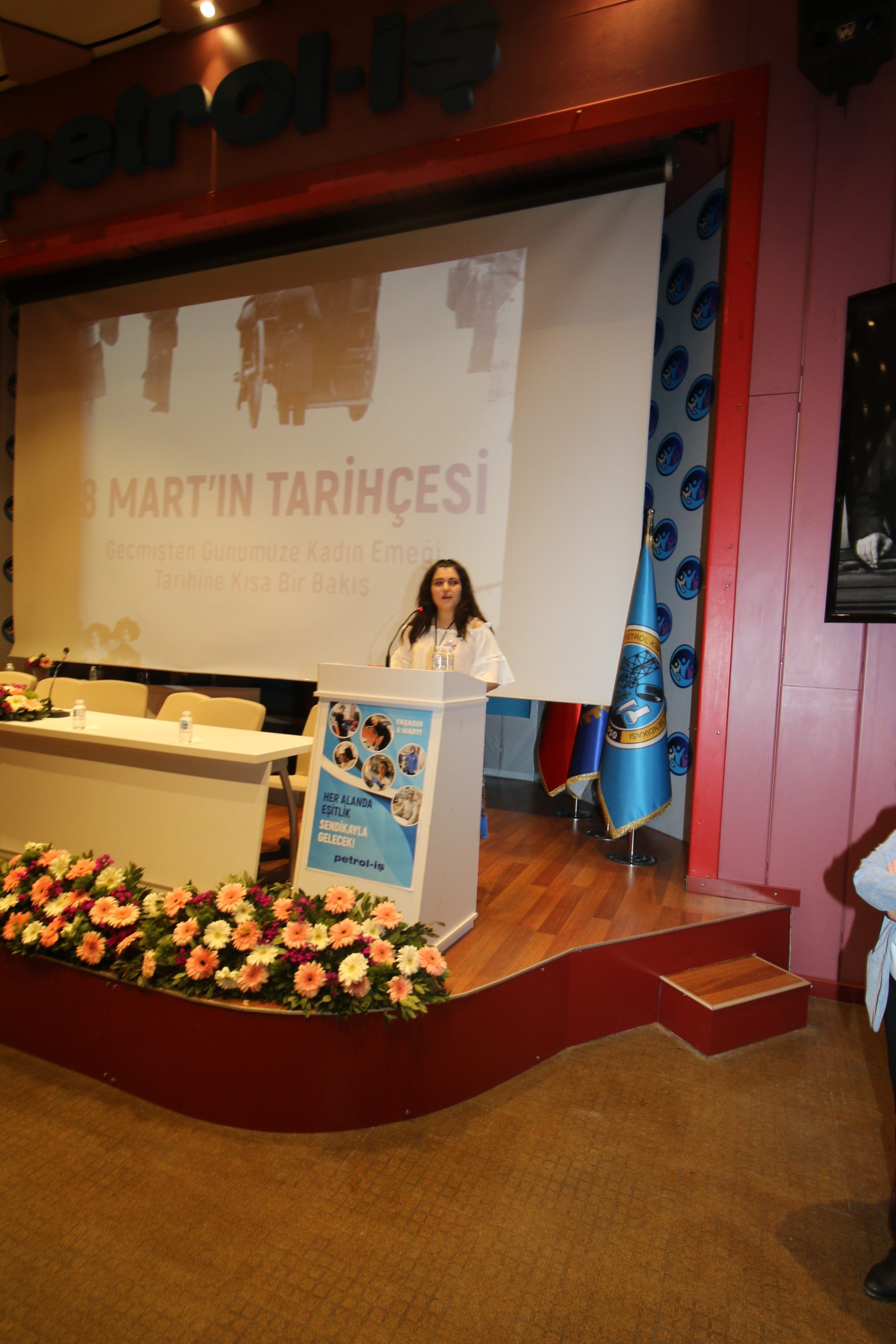 Genel Başkan Süleyman Akyüz’ün konuşmasının ardından 8 Mart’ın düzeltilmiş tarihçesinin anlatıldığı slayt gösterisi yapıldı ve sonrasında Petrol-İş’in örgütlü olduğu işyerlerinden kadınların konuştuğu, dertleştiği, taleplerini ve sendikalı olmaktan duydukları memnuniyeti paylaştıkları “Kadınız, Petrol-İş’liyiz, Söyleyecek Sözümüz Var!” bölümüne geçildi.